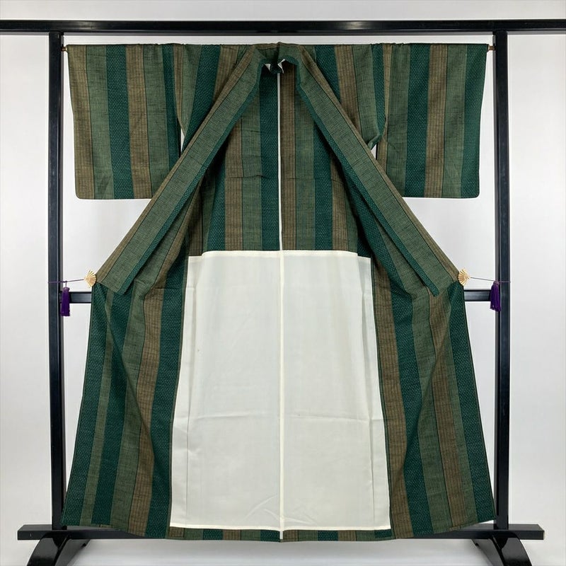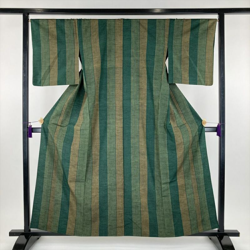 (中古) 単衣紬 深緑色 カジュアル 織り 変わり縞 ひとえ SS【身丈】154cm【裄丈】67cm