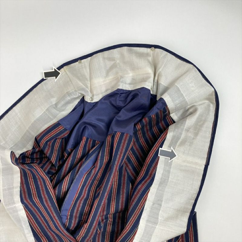 単衣の着物は裏地がついていません、袷の着物よりも軽く、風通しが良いのが特徴です。 袷ほど着る期間は長くないですが、春に急に気温が上がったときや、まだ暑さの残っている秋口に活躍します。現在は、温暖化のため単衣を長い期間(2ヶ月~5ヶ月未満)着用する人が増えてきました。衿裏に汚れ、生地の弱り、継ぎがございます。保存臭がややございます。