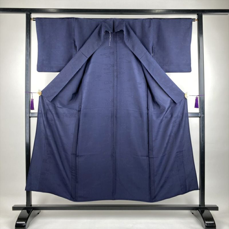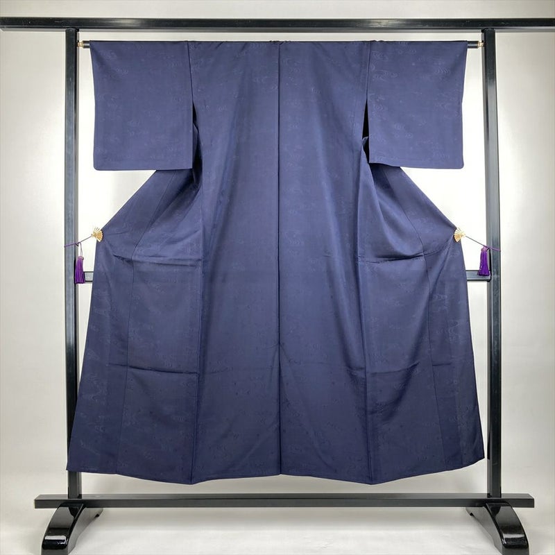 (中古)単衣紬 紺 カジュアル 地紋織り 流水 波頭 ひとえ SS【身丈】148cm【裄丈】64cm