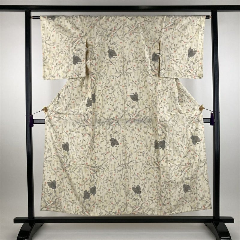 (中古) 単衣紬 生成り色 カジュアル 織り 蝶 花木 ひとえ SS【身丈】150.5cm【裄丈】63.5cm