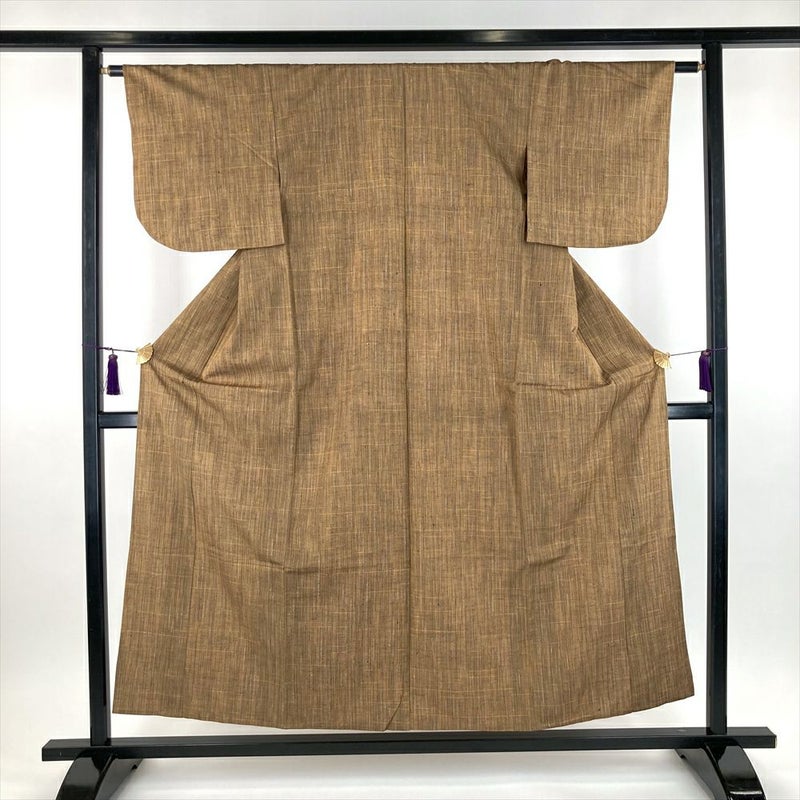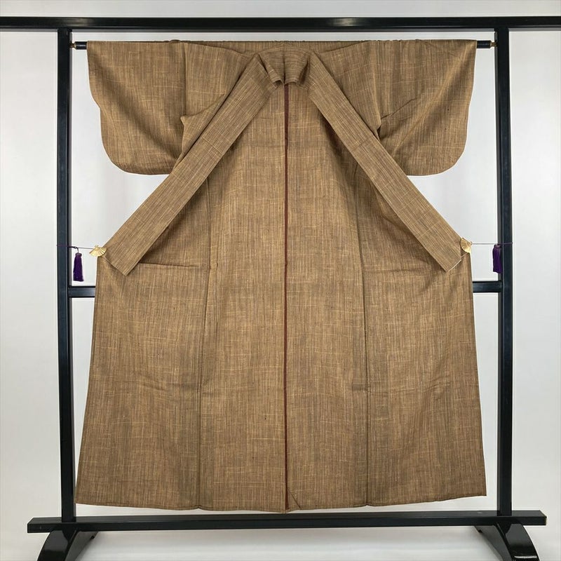 (中古) 単衣紬 薄茶色 カジュアル 織り途切れ縞 ひとえ SS【身丈】151.5cm【裄丈】63cm