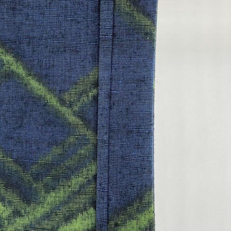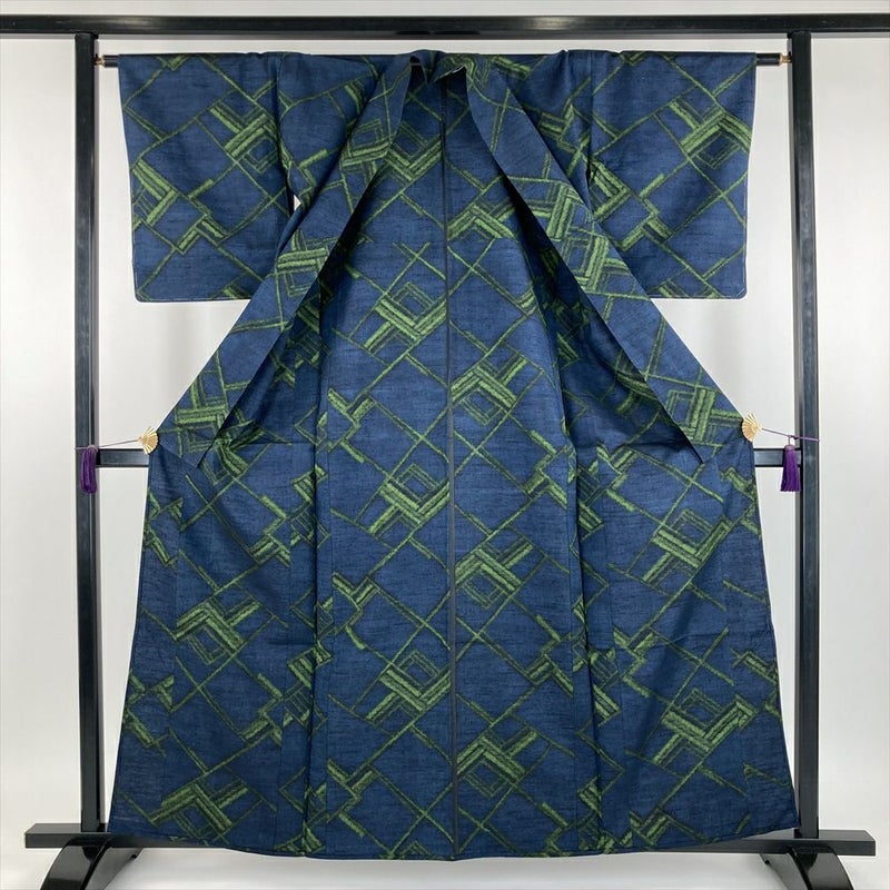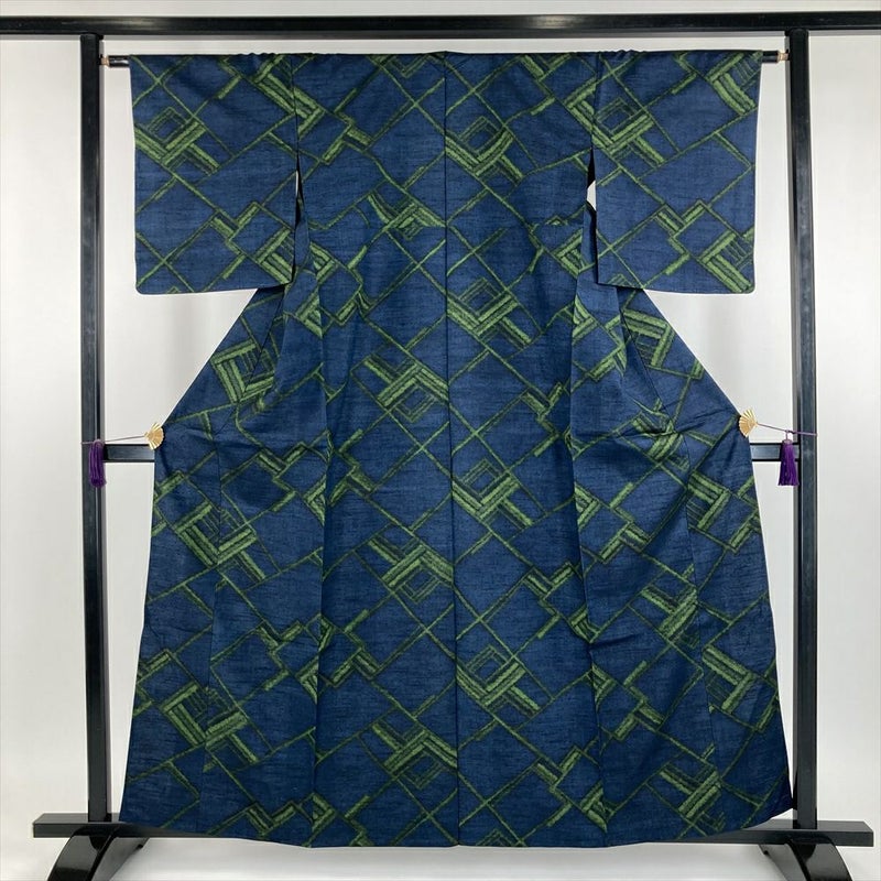 (中古) 紬 青 紺色 カジュアル 松皮菱 単衣【身丈】156cm【裄丈】63.5cm