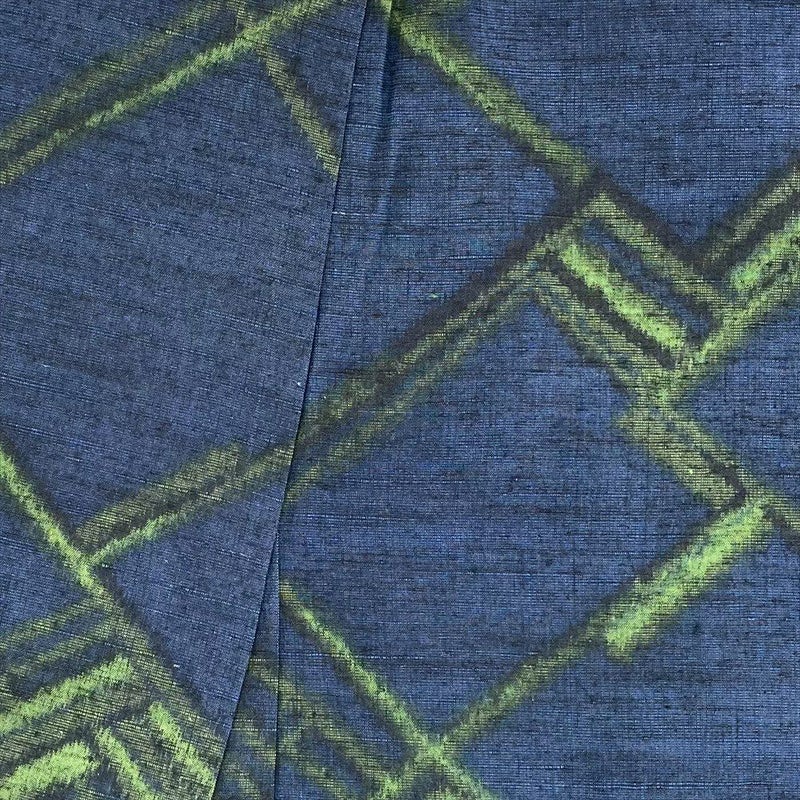 【着物をより身近に!洋服感覚で楽しむコーディネート】紺色×黄緑色の配色がモダンでおしゃれな着物は、短めに着付けて、ショートブーツを合わせてみてはいかがでしょうか?ショートブーツはカジュアルなアイテムですが、着物と合わせることで、モダンで洗練された印象に仕上がります。足元が軽やかに見え、動きやすいのも魅力です。普段使いしやすいコーディネートになり、着物初心者の方でも気軽に挑戦できます。保存臭がややございます。