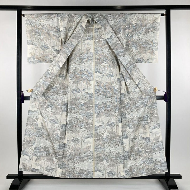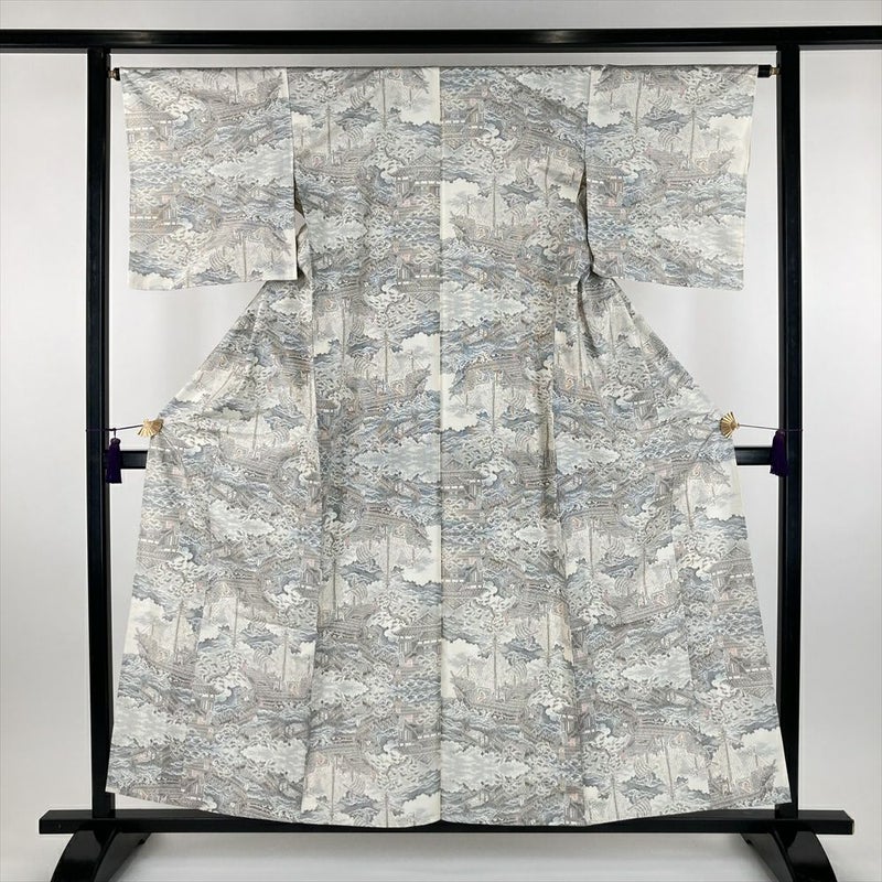 (中古) 単衣紬 生成り色 カジュアル 織り 港 舟 ひとえ SS【身丈】153cm【裄丈】64.5cm