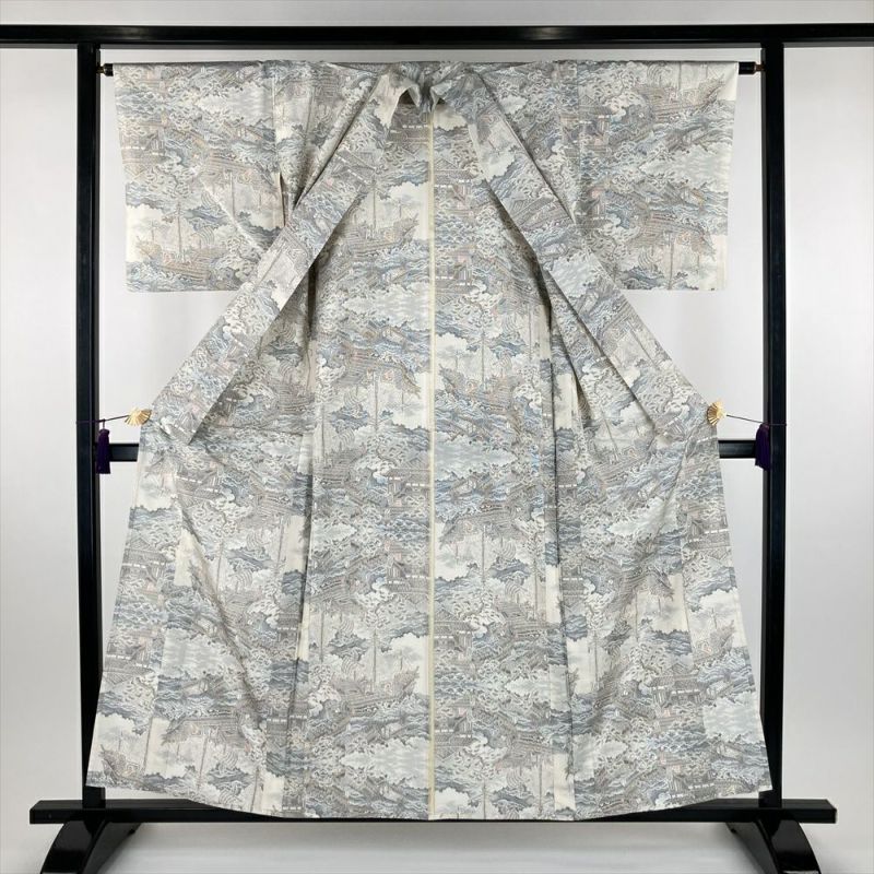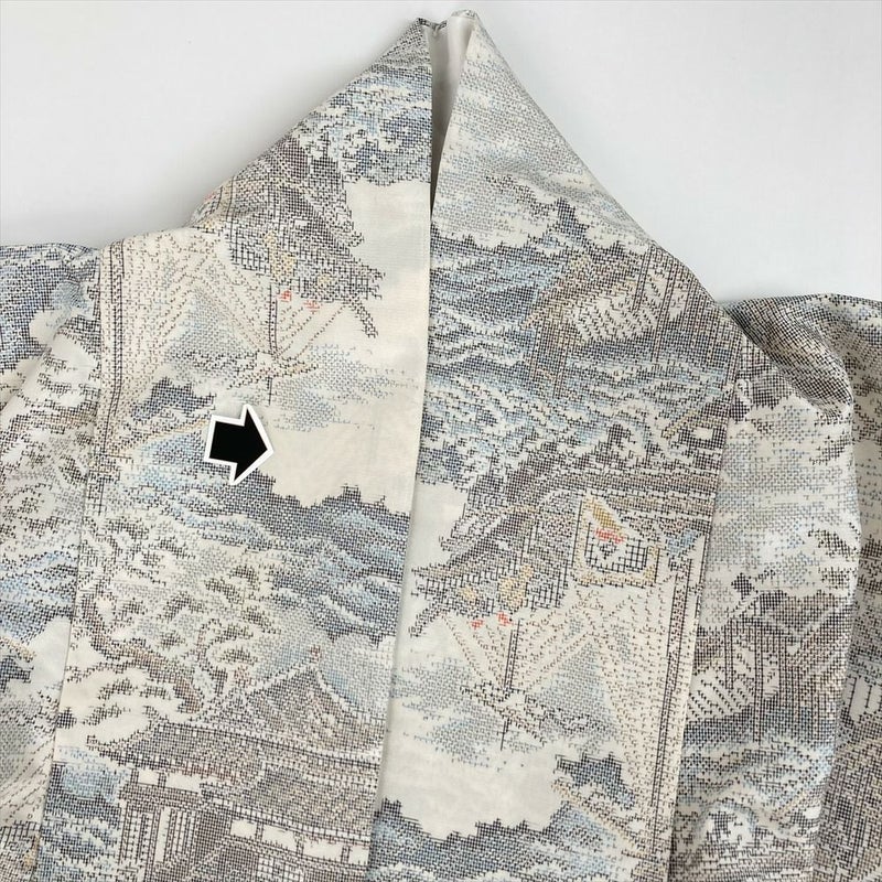 単衣の着物は裏地がついていません、袷の着物よりも軽く、風通しが良いのが特徴です。 袷ほど着る期間は長くないですが、春に急に気温が上がったときや、まだ暑さの残っている秋口に活躍します。現在は、温暖化のため単衣を長い期間(2ヶ月~5ヶ月未満)着用する人が増えてきました。衿に汚れがございます。保存臭がややございます。