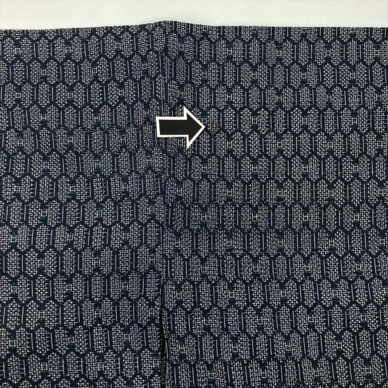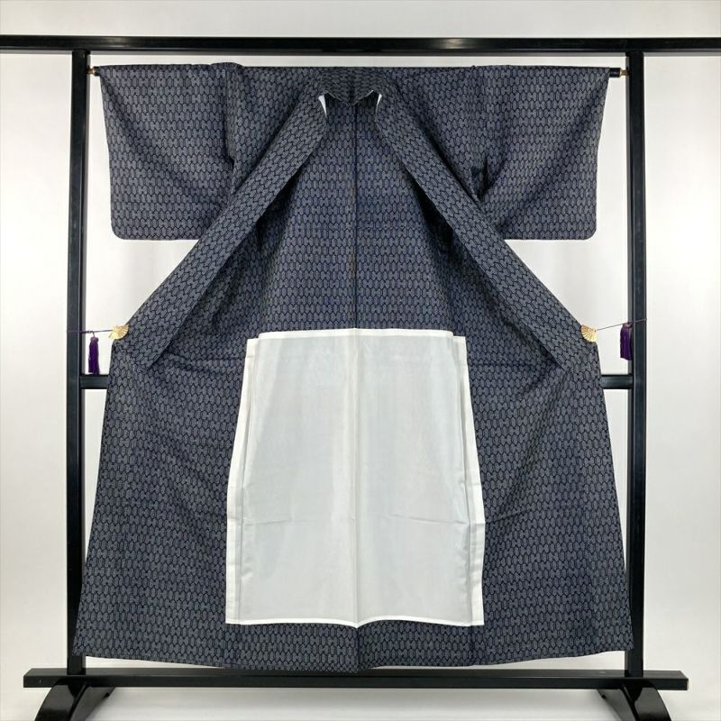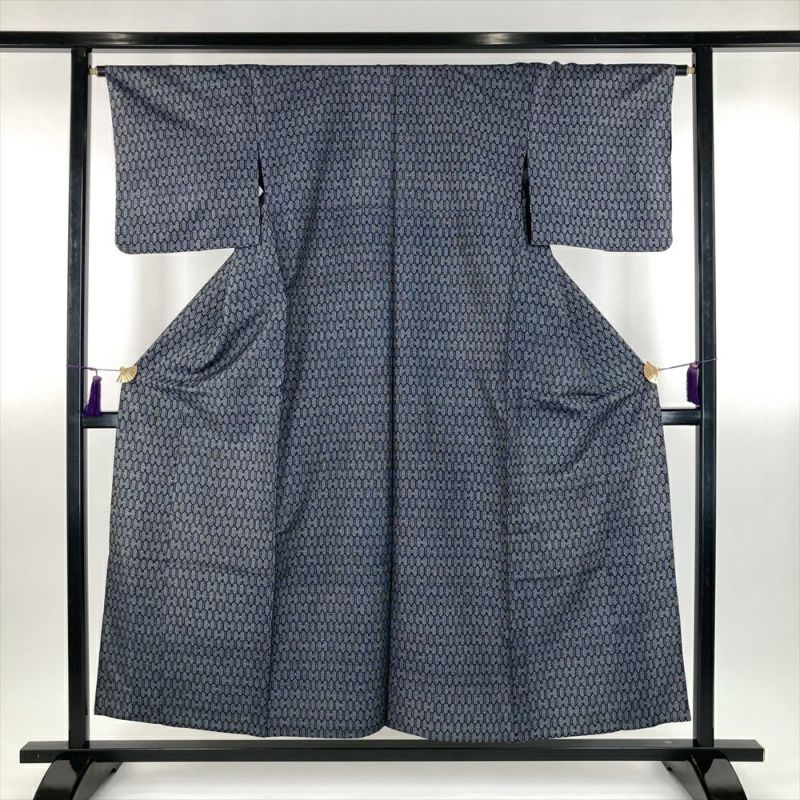 (中古) 単衣紬 紺色 カジュアル 織り 亀甲 ひとえ SS【身丈】150.5cm【裄丈】65cm