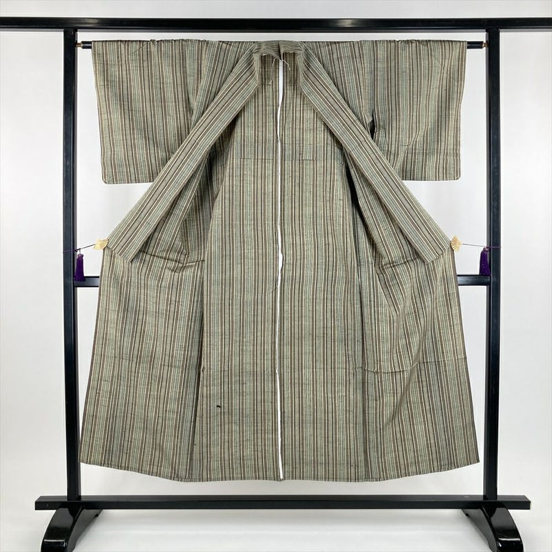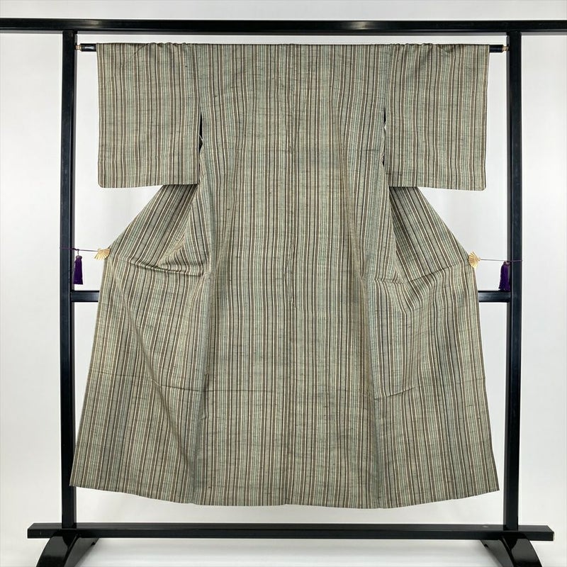 (中古) 単衣紬 緑 山葵色 カジュアル 織り 縞 ひとえ SS【身丈】145cm【裄丈】62cm