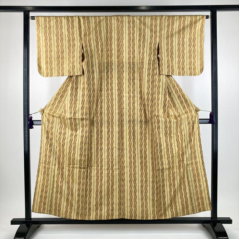 (中古) 単衣紬 薄黄色 カジュアル 織り 縞 絣柄 ひとえ SS【身丈】150.5cm【裄丈】64.5cm