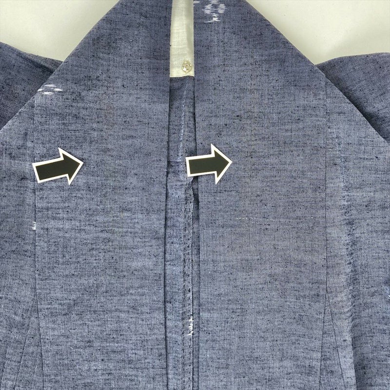 単衣の着物は裏地がついていません、袷の着物よりも軽く、風通しが良いのが特徴です。 袷ほど着る期間は長くないですが、春に急に気温が上がったときや、まだ暑さの残っている秋口に活躍します。現在は、温暖化のため単衣を長い期間(2ヶ月~5ヶ月未満)着用する人が増えてきました。衿に汚れがございます。保存臭がややございます。