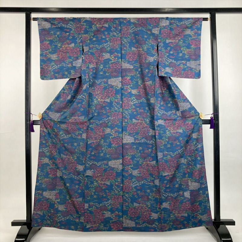 (中古) 単衣紬 錆青 カジュアル 牡丹 垣根 ひとえ S【身丈】159cm【裄丈】63cm