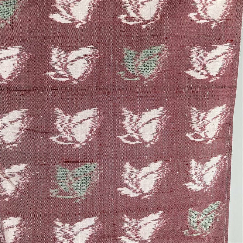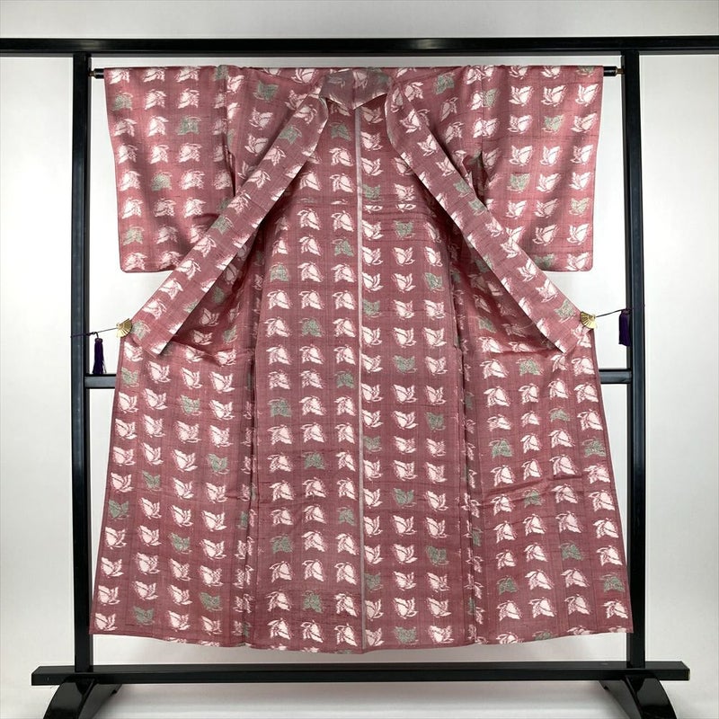 (中古) 単衣紬 赤色 カジュアル 織り 蝶 花木 ひとえ S【身丈】157.5cm【裄丈】64cm