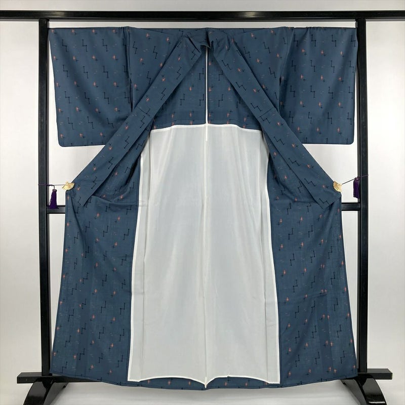 (中古) 単衣紬 グレー 灰青色 カジュアル 織り 絣柄 ひとえ S【身丈】157.5cm【裄丈】71cm