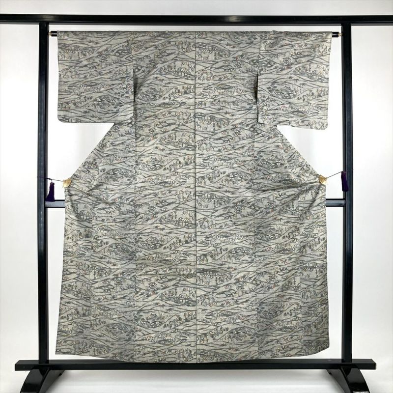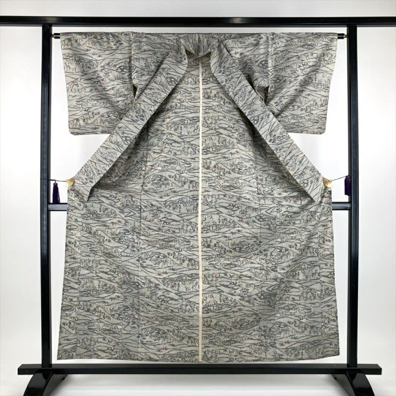 (中古) 単衣紬 グレー 薄灰色 カジュアル 織り 里山の景色 ひとえ SS【身丈】154cm【裄丈】64cm