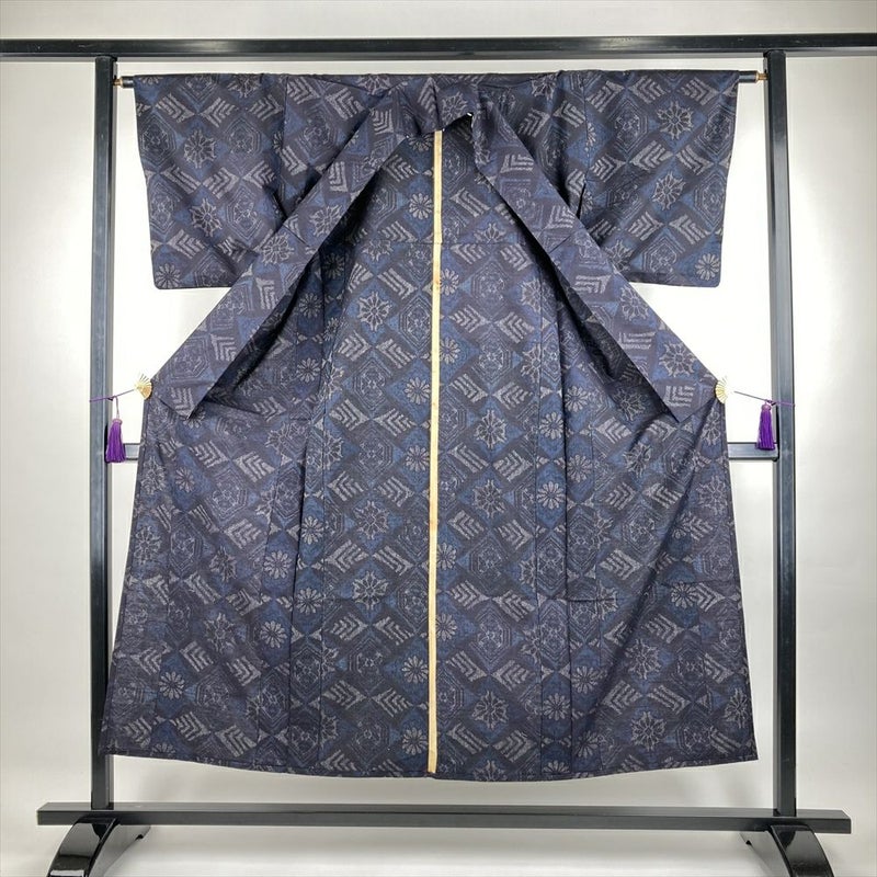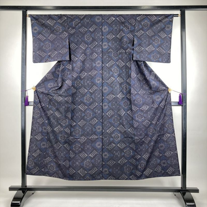 (中古)単衣紬 濃紺 カジュアル 織り 菱取り 華文 ひとえ SS【身丈】147cm【裄丈】64cm