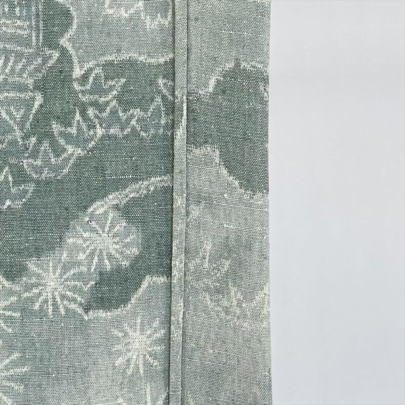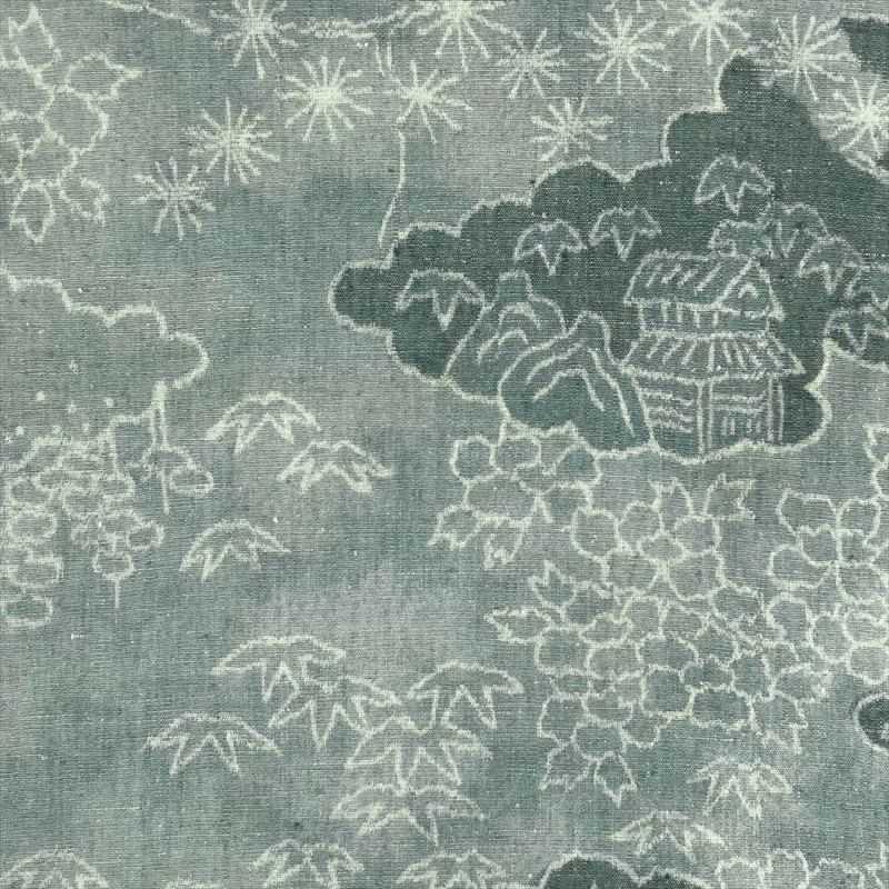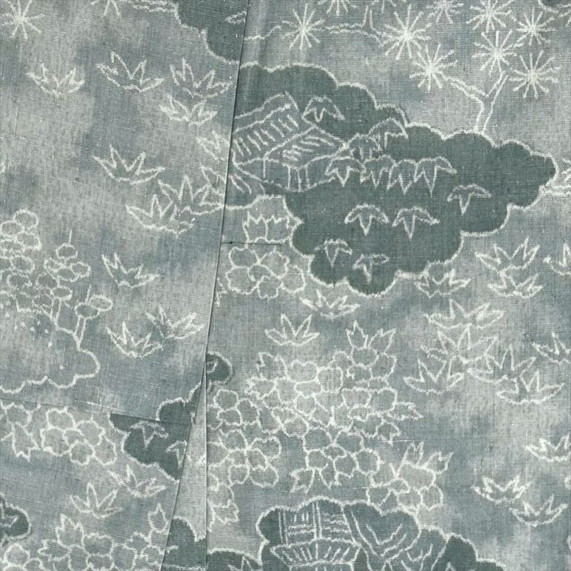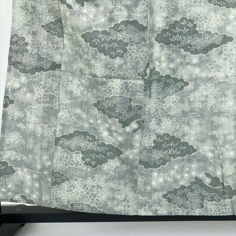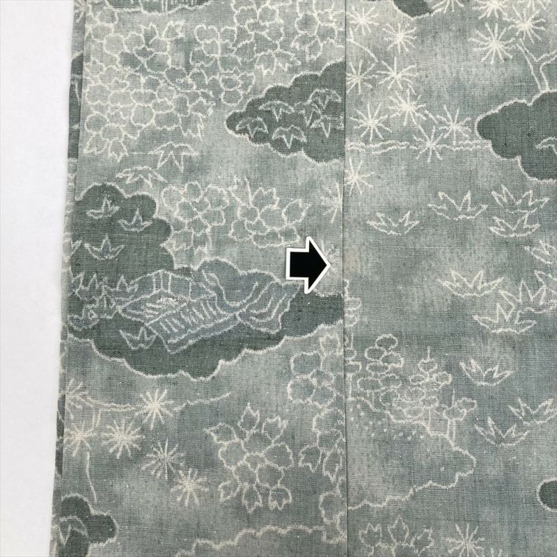 優しい色合いが醸し出す上品さ、薄緑色は、自然の緑を思わせる優しい色合いです。この上品な色合いが、四季の花々の美しさを際立たせます。華やかすぎず、落ち着いた印象を与えるため、幅広い年齢層の方に似合うのも魅力です。木綿の名古屋帯や半幅帯を合わせると、普段使いにぴったりのカジュアルな装いになります。ぜひ、あなただけのコーディネートを楽しんでみてください。上前に汚れがございます。右後に糸混じりがございます。保存臭がややございます。