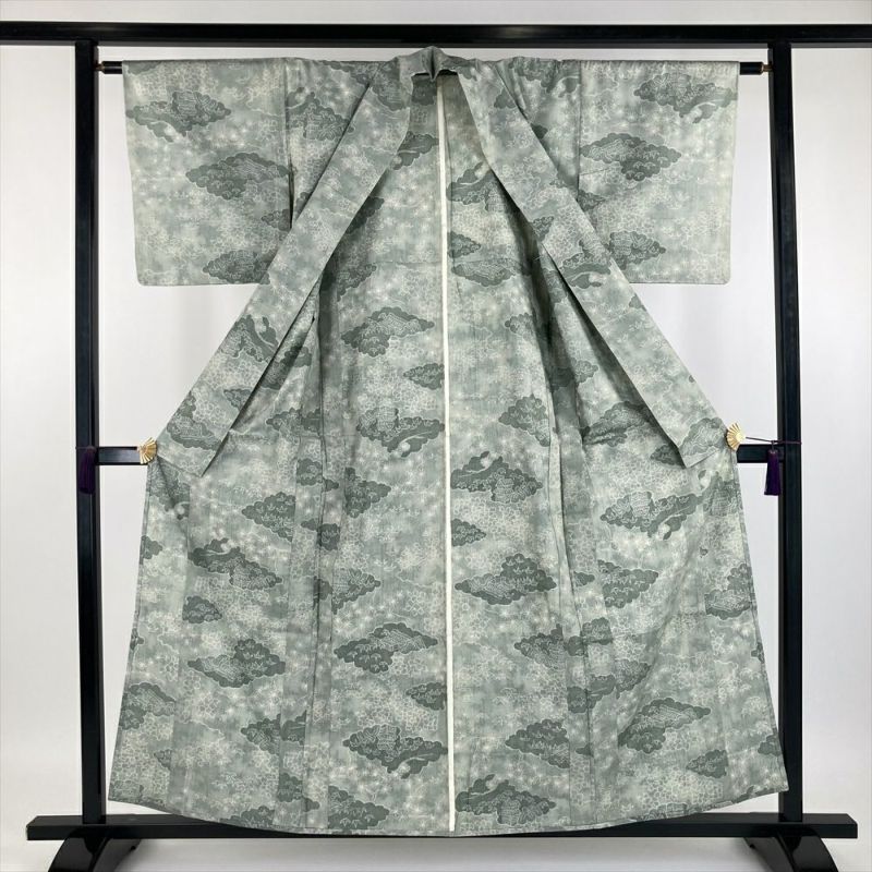(中古) 紬 薄緑色 カジュアル 四季花 雲 単衣【身丈】153.5cm【裄丈】63cm