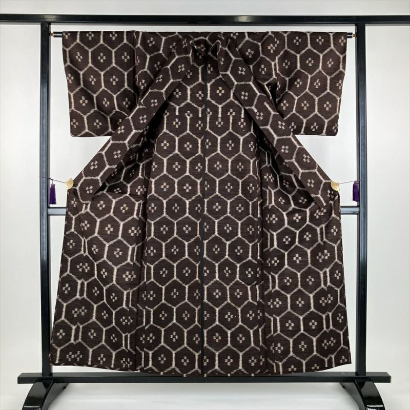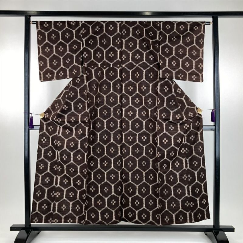 (中古) 単衣紬 焦げ茶色 カジュアル 織り 亀甲 ひとえ SS【身丈】152.5cm【裄丈】63.5cm