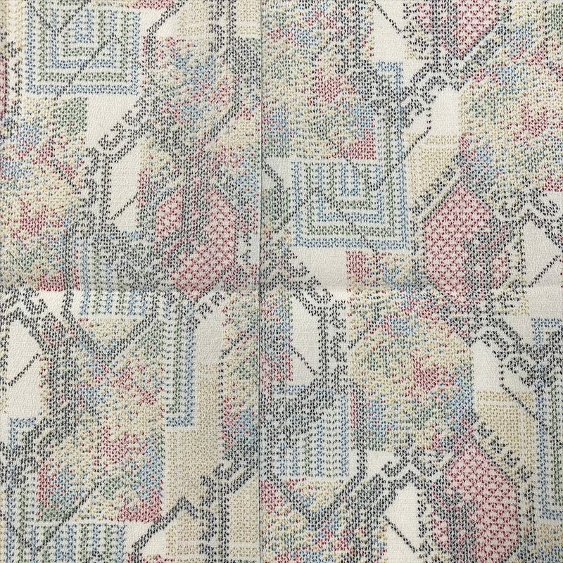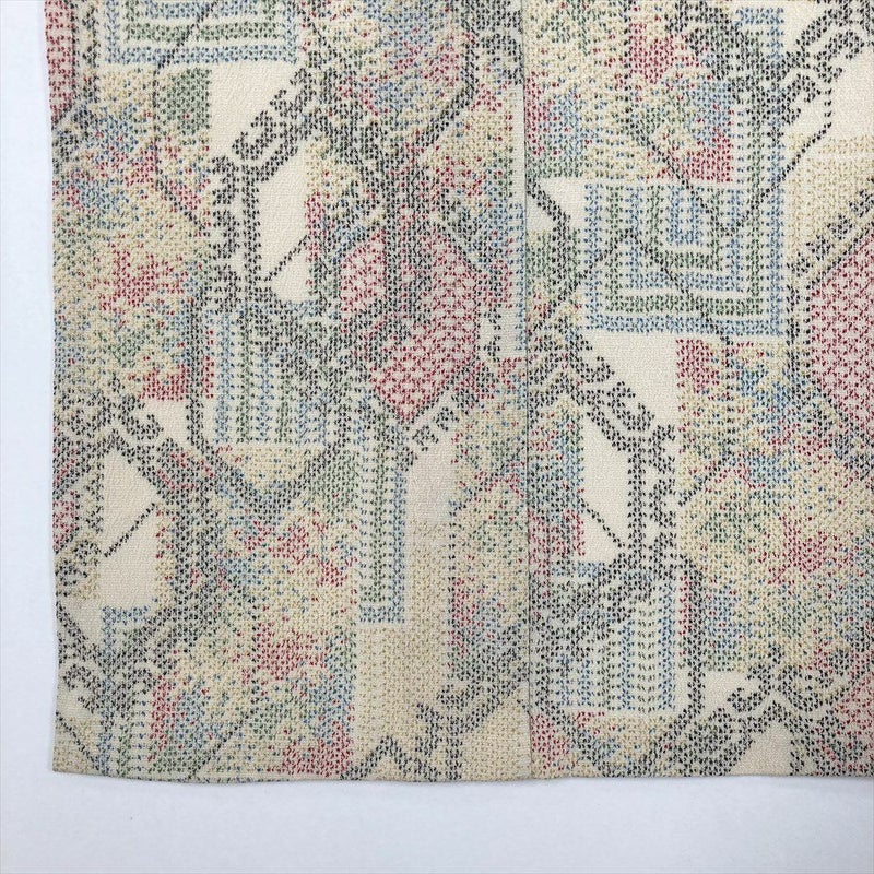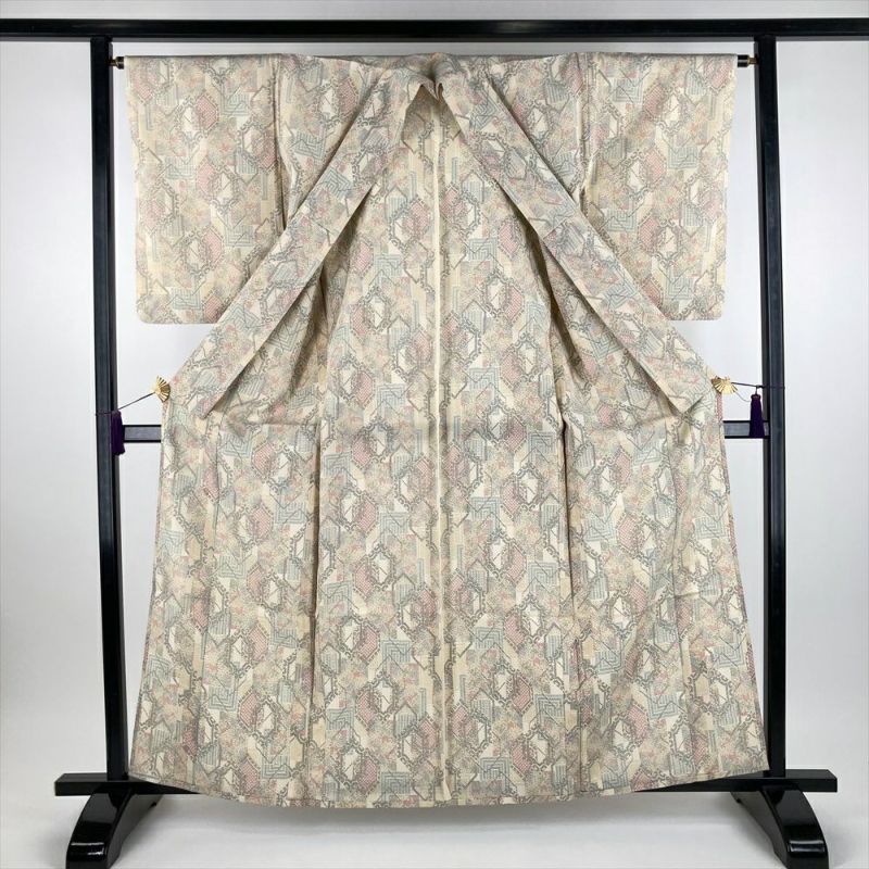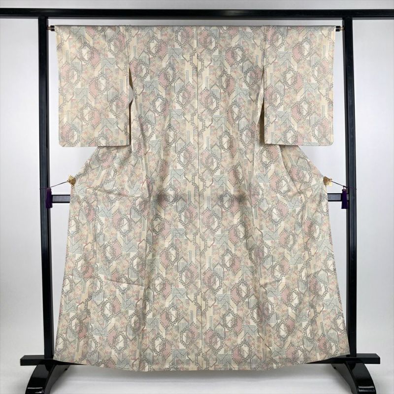 (中古) 単衣紬 生成り色 カジュアル 織り シボ 亀甲 短冊 ひとえ S【身丈】158cm【裄丈】66cm