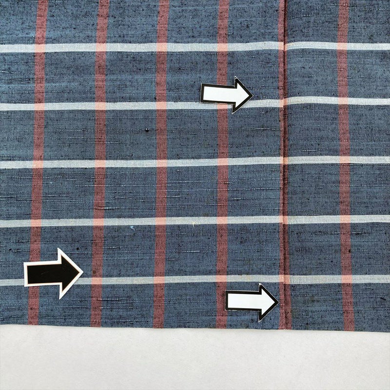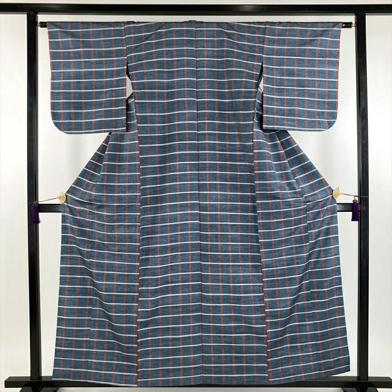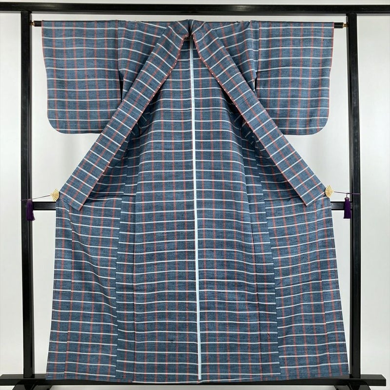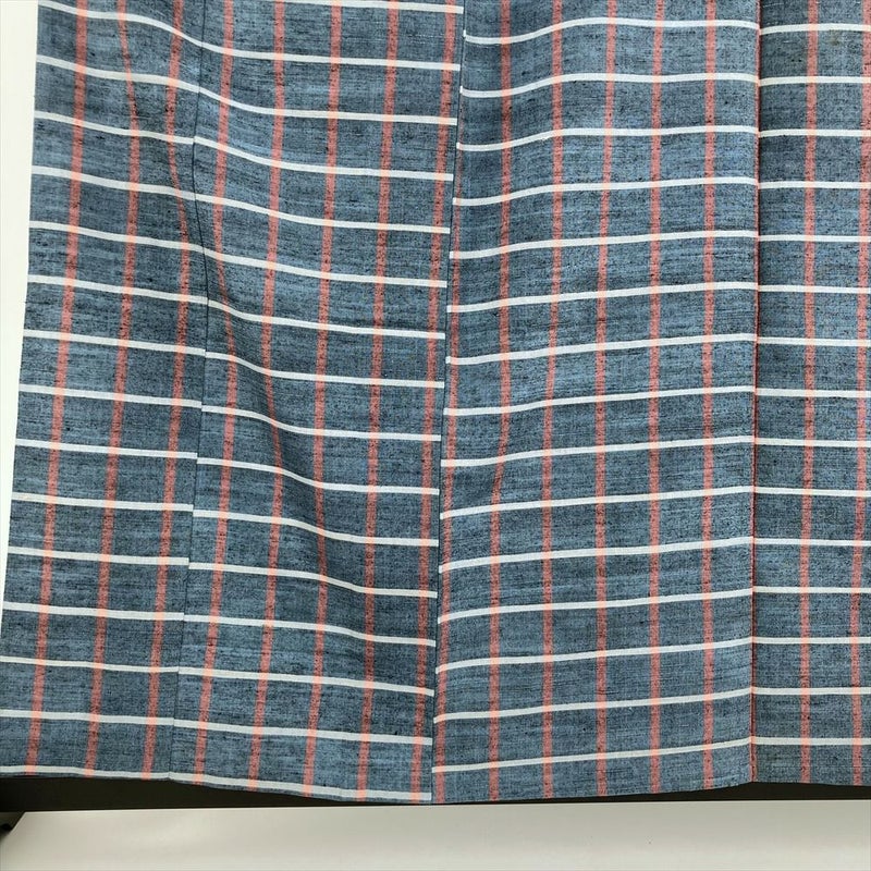 格子柄の着物は、そのシンプルながらも奥深い魅力から、古くから多くの人々に愛されてきた伝統的な柄の一つです。 格子柄は、時代や流行に左右されることなく、普遍的な美しさを持ち合わせています。赤白の格子は、日本の伝統色である赤と白の組み合わせが特徴です。薄い藍色とのコントラストが、視覚的に美しく、目を引きます。ぜひ、色々な場所で着て、楽しんでみてください。右後に汚れがございます。保存臭がややございます。
