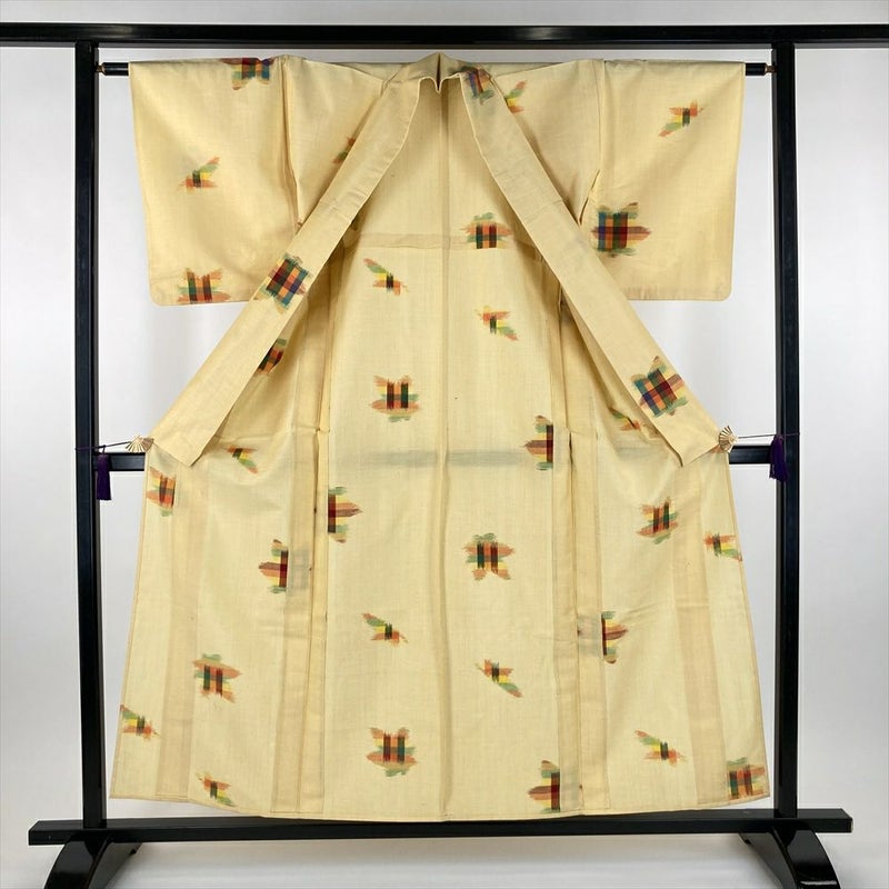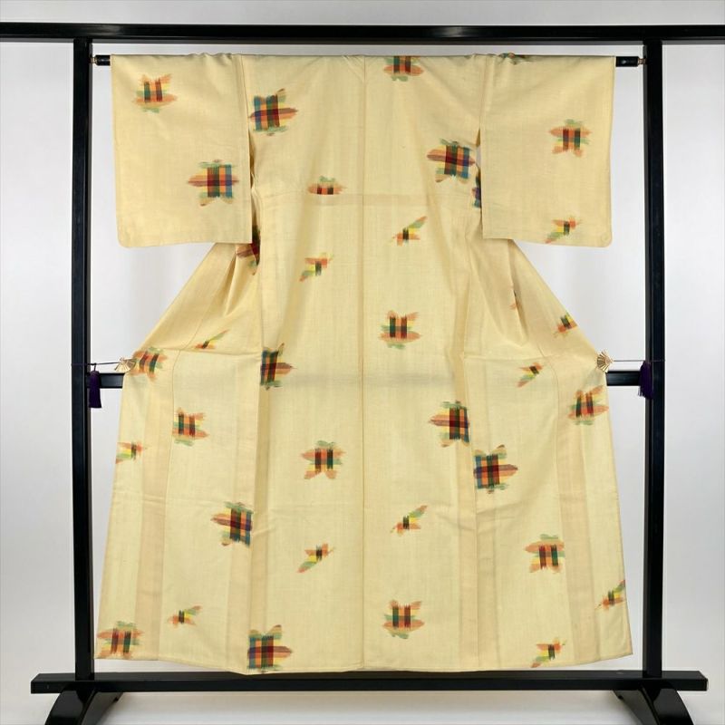(中古) 単衣紬 黄色 卵色 カジュアル 織り もみじ ひとえ SS【身丈】151cm【裄丈】62.5cm