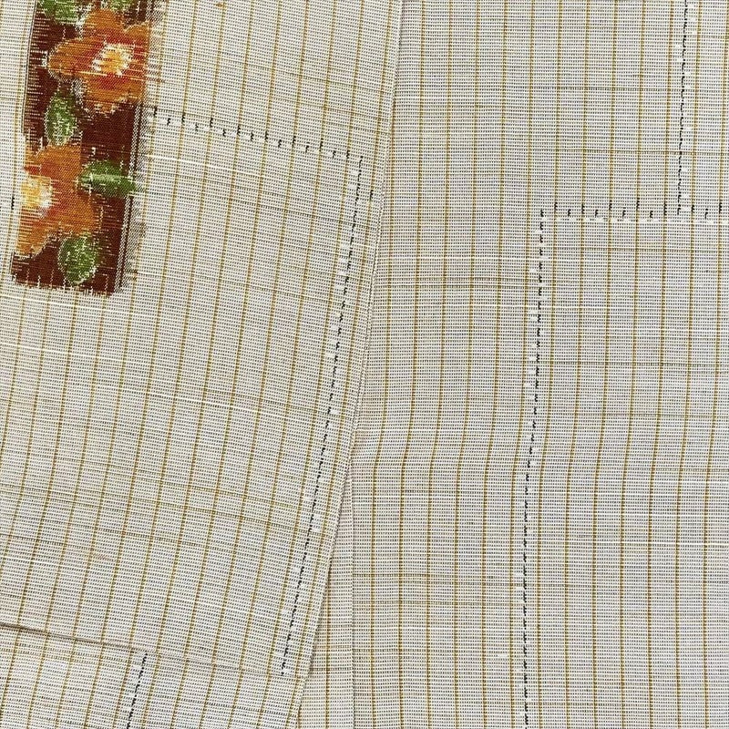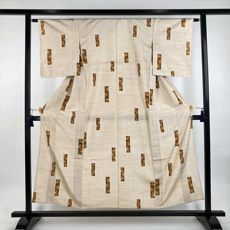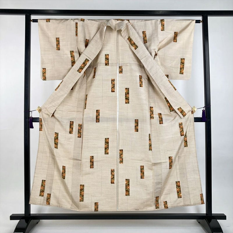 (中古) 単衣紬 生成り カジュアル 縞 椿 ひとえ SS【身丈】149cm【裄丈】62cm