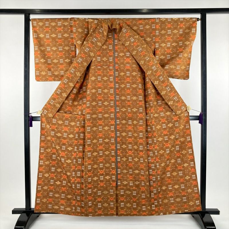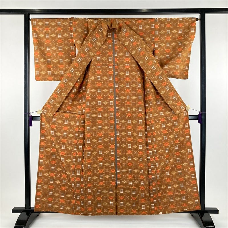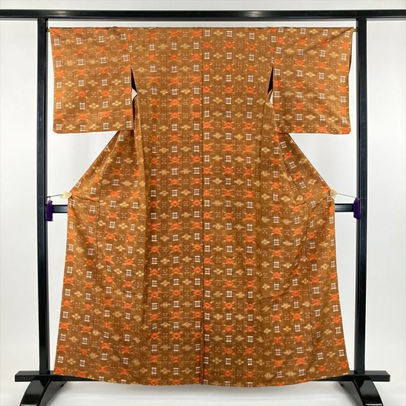 (中古) 単衣紬 オレンジ 黄茶色 カジュアル 織り 椿 絣柄 ひとえ S【身丈】157cm【裄丈】67cm