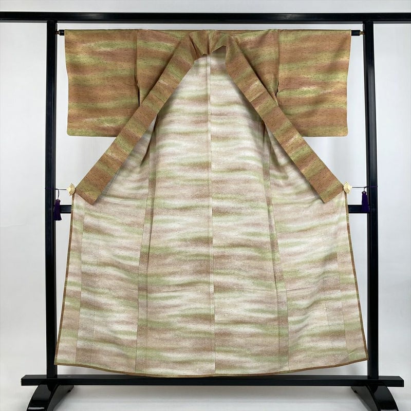 (中古) 単衣紬 薄茶 薄緑 カジュアル グラデーション ひとえ SS【身丈】152cm【裄丈】63cm