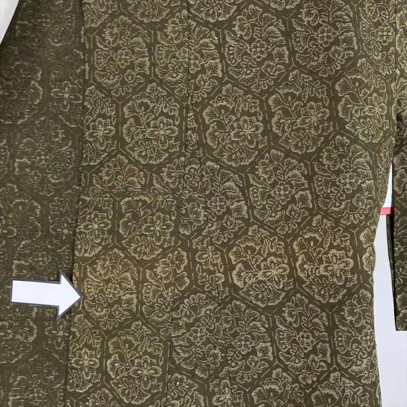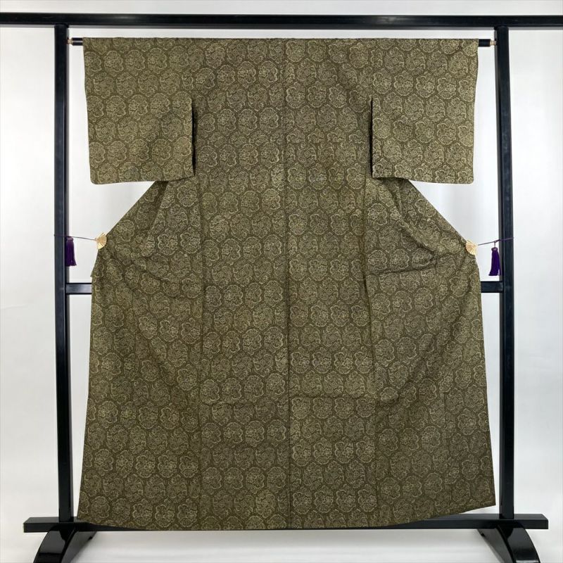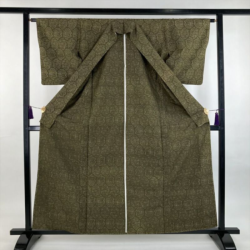 (中古) 単衣紬 柳茶色 緑 カジュアル 紬地 亀甲 オリエンタルな草花 ひとえ S【身丈】157cm【裄丈】63cm