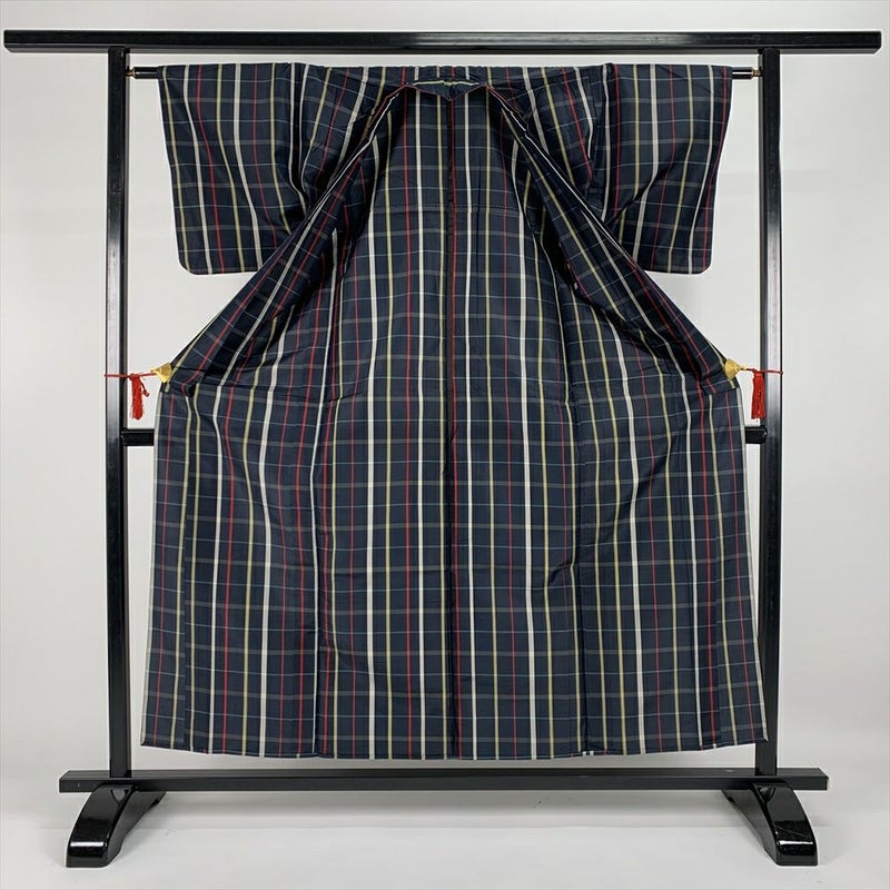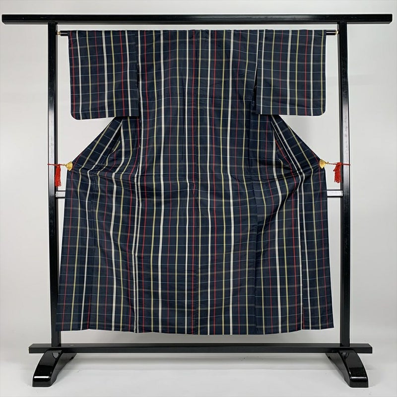 (中古)単衣紬 カジュアル 紺 チェック 未洗い ひとえ SS【身丈】152.5cm【裄丈】63.5cm