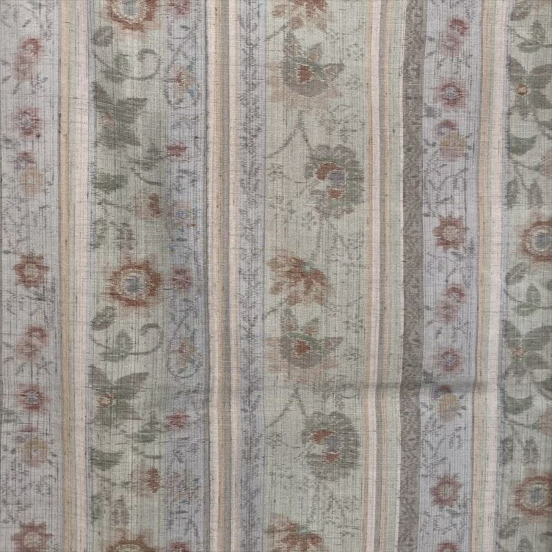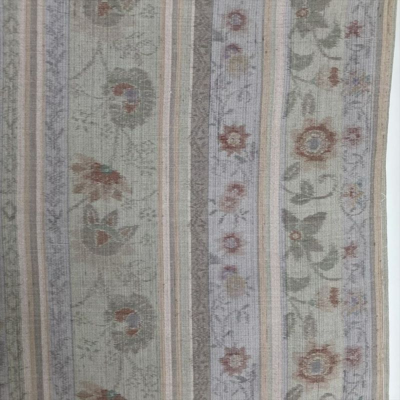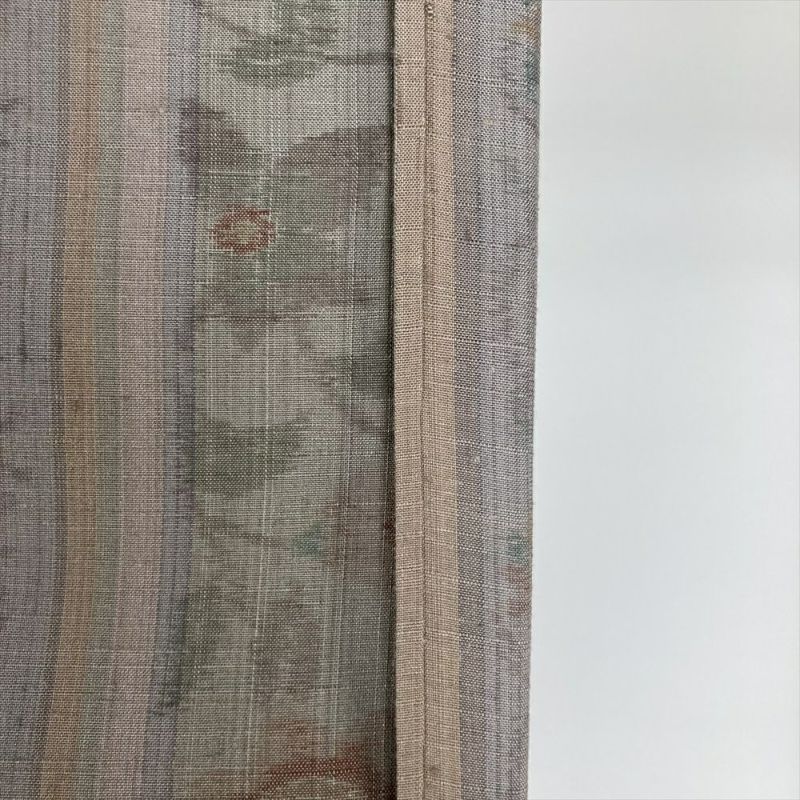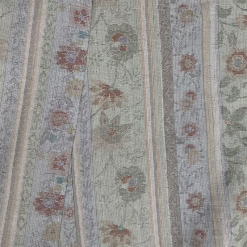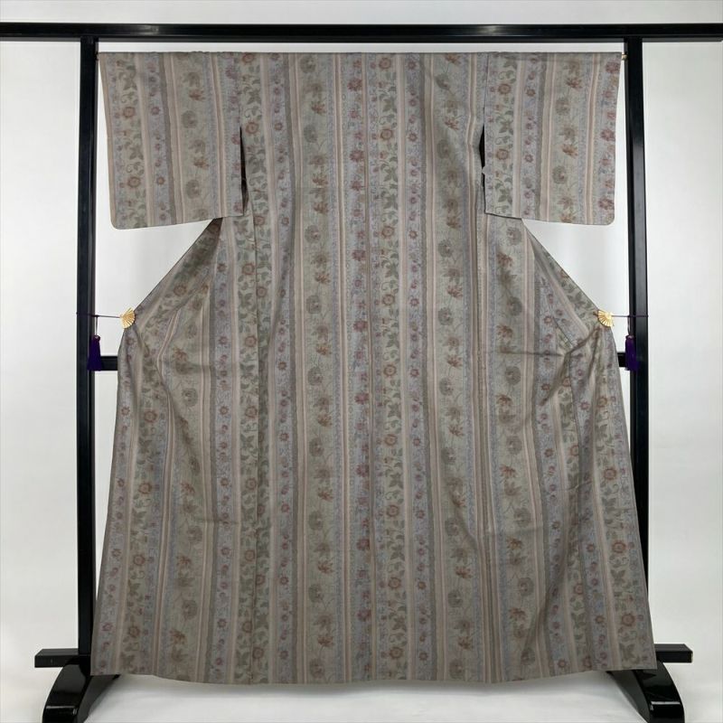 屋や緑がかった印象の縦縞に更紗文様の紬です。縞柄は、着物の中でも定番の柄ですが、そこに植物柄を組み合わせることで、個性を出すことができます。また、植物柄は、着物に優しい雰囲気を与えてくれます。