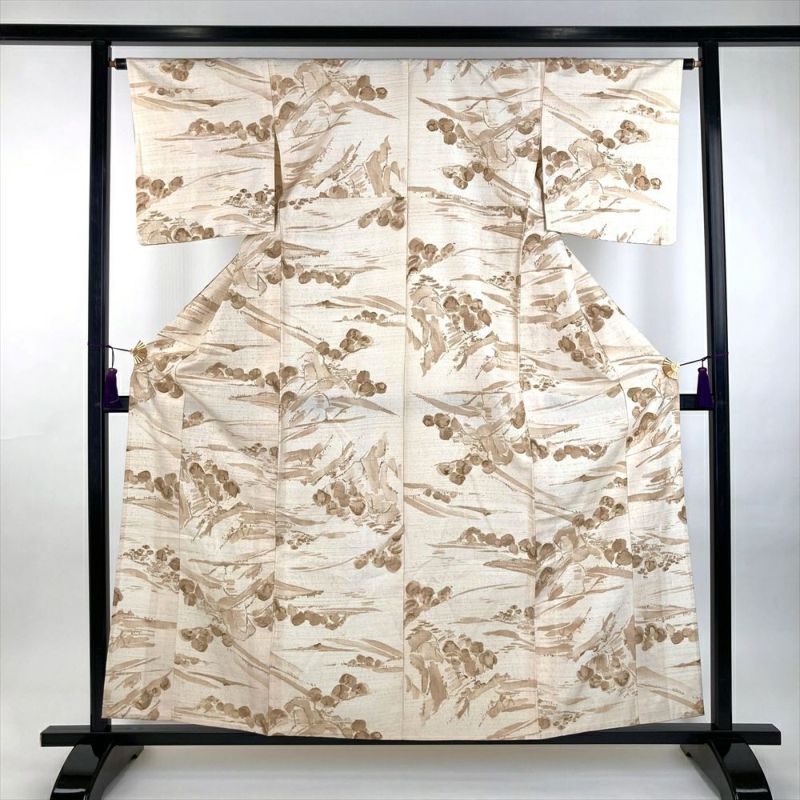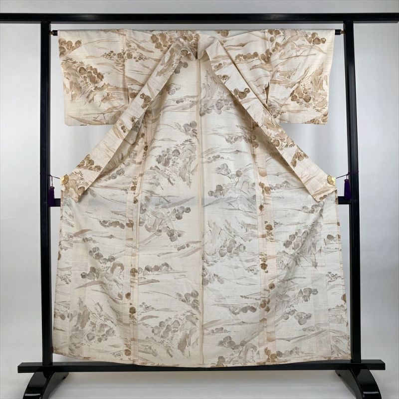 (中古) 単衣紬 薄茶 ベージュ カジュアル 織り 染め 里山の景色 ひとえ S【身丈】157cm【裄丈】65cm