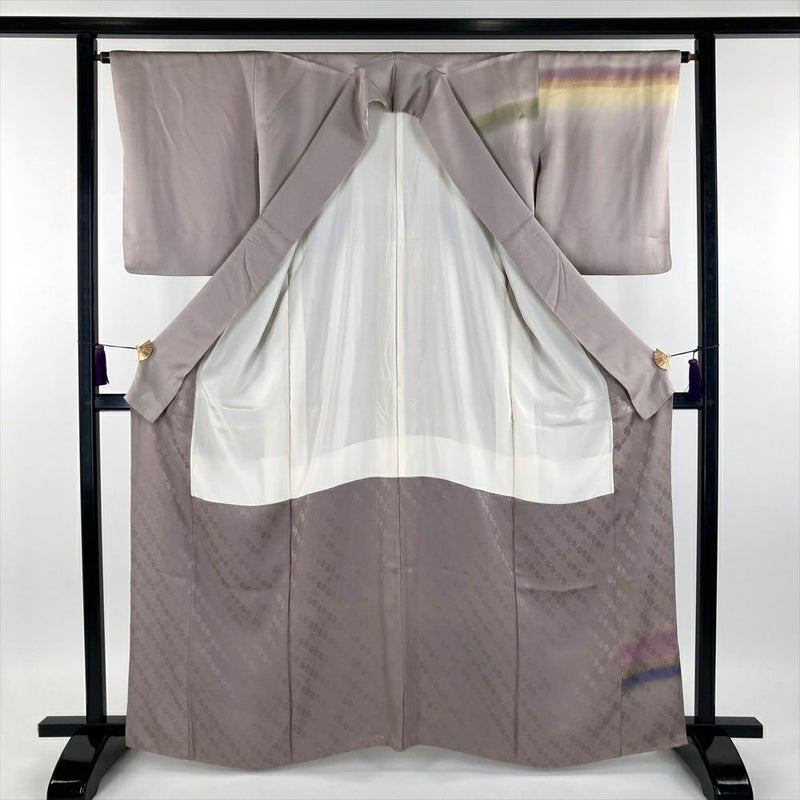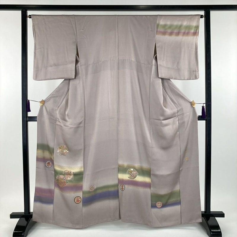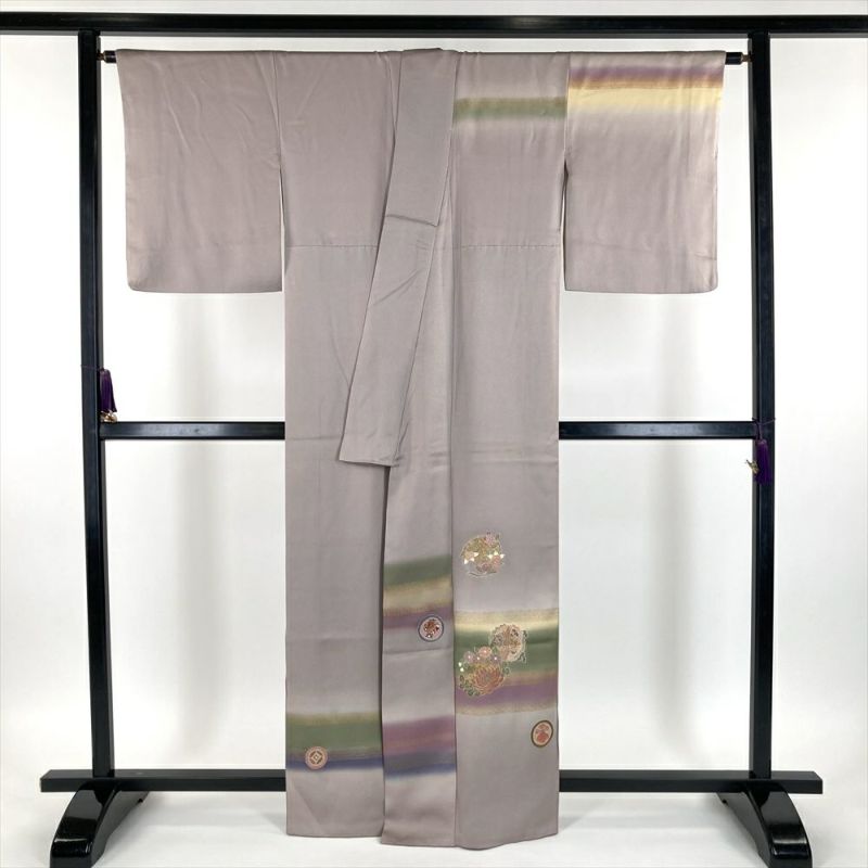 (中古) 訪問着 茶鼠色 グレージュ色 セミフォーマル 地紋織り 染め 金彩 鳳凰 四季花 宝尽くし 袷 M【身丈】160cm【裄丈】64cm