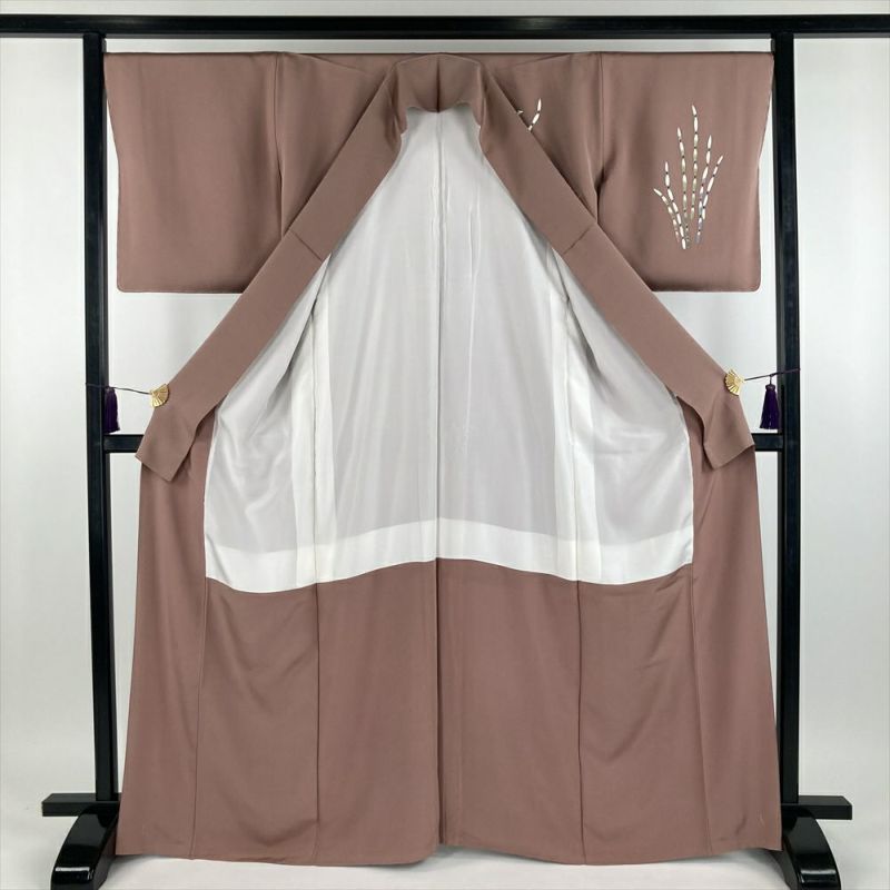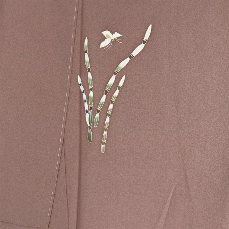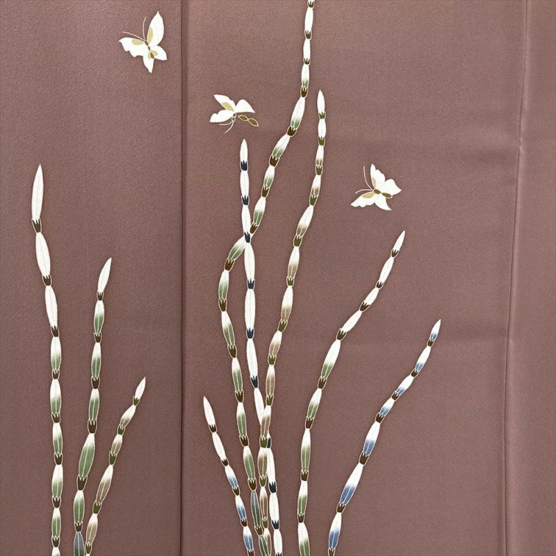 金丸修一氏の手によって生み出された、本加賀友禅の傑作。梅染色(うめぞめいろ)赤みのある淡茶色で染められたちりめん生地に、木賊と蝶の繊細な陰影が映し出されています。軽やかな柄付けと抑えられた色使いが、モダンな雰囲気を醸し出し、幅広いシーンで活躍します。仕付け糸付き、未使用に近い状態も魅力です。永くご愛用いただける、一生ものの着物をお探しの方に。