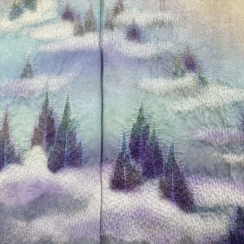 柄:木立が霞の中にぼんやりと現れる様子が、自然の息吹を感じ、繊細に表現されています。丁寧に染め分けられた絞りの技術は、自然の奥深さを表現し、見る者の心を穏やかにします。