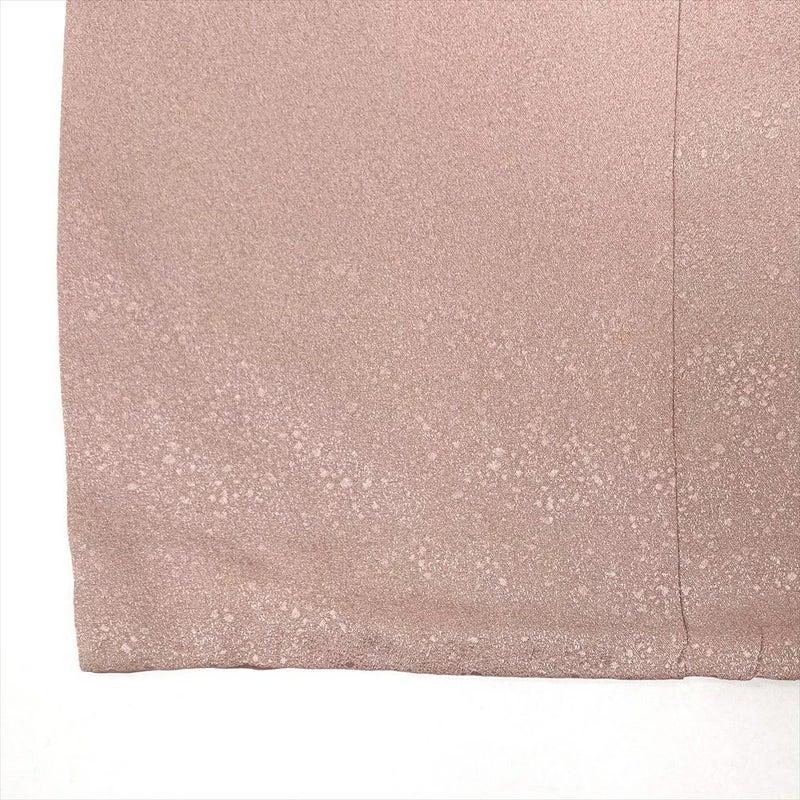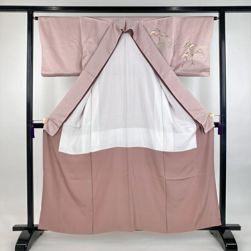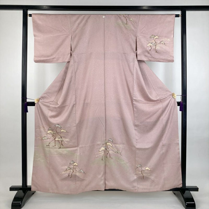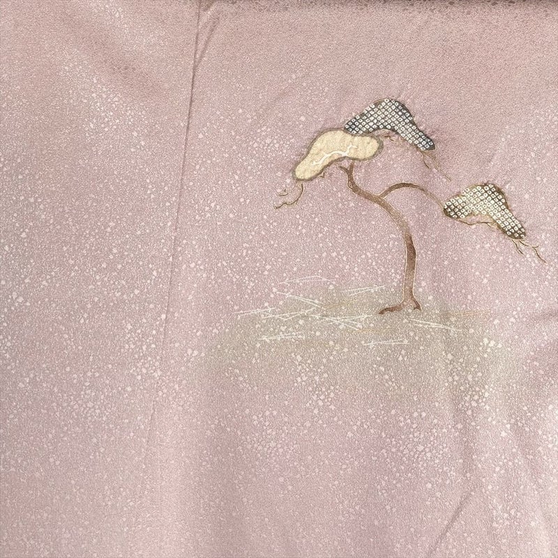 (中古)訪問着 灰ピンク セミフォーマル 地紋織り 染め 絞り 金彩 一つ紋 白砂清松 袷 S【身丈】157cm【裄丈】64cm