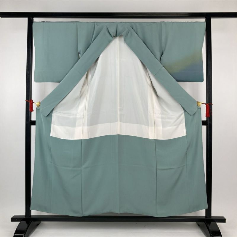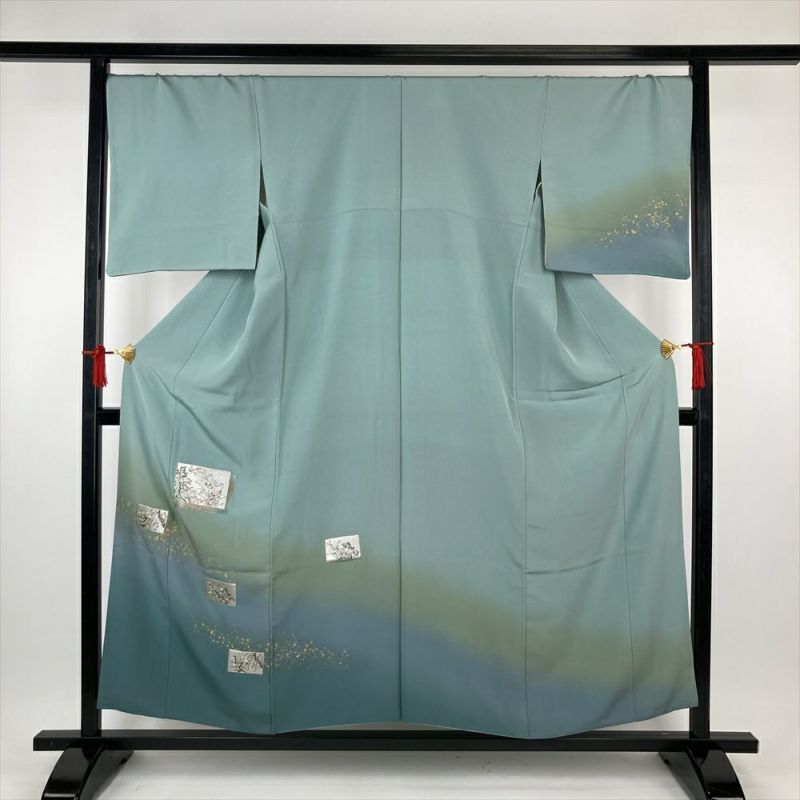 (中古)訪問着 青磁色 フォーマル セミフォーマル ちりめん ぼかし染め 金彩 銀彩 刺繍 色紙 袷 SS【身丈】152.5cm【裄丈】70.5cm