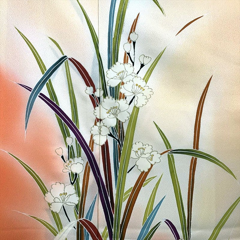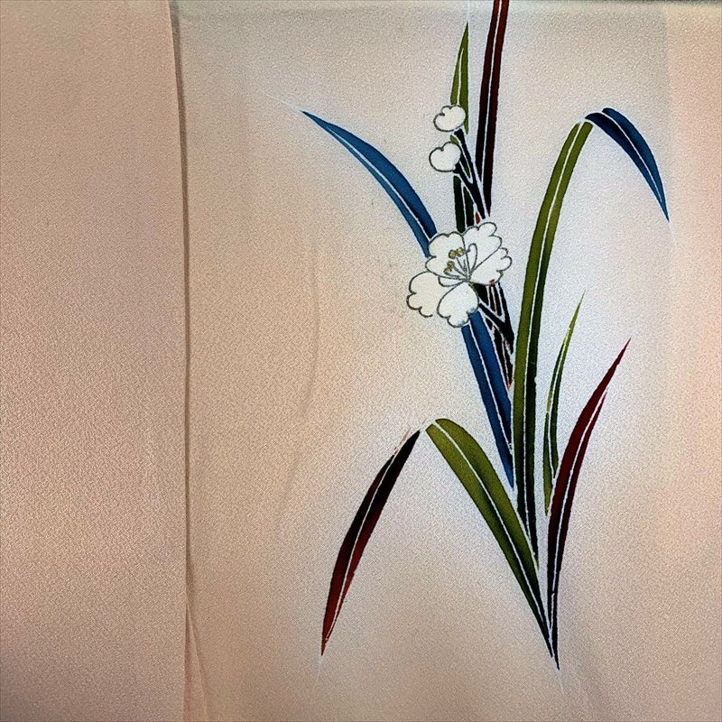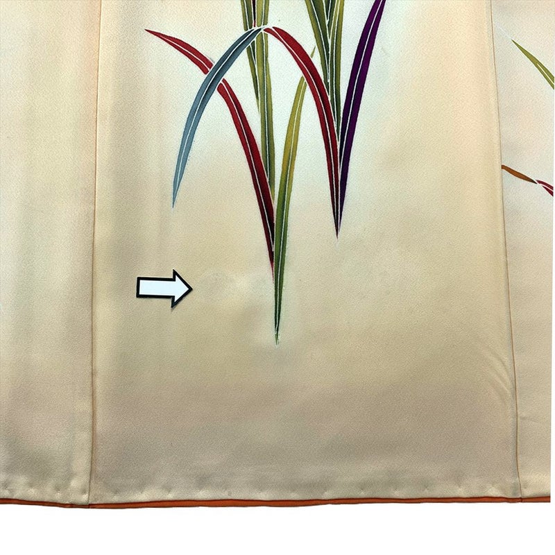 帯次第で、式典やお茶会、披露宴などにお使いいただけるお着物になります。上前に大きいシミ、花の柄に黄色いシミ、胸元と衿に汚れ複数、袖口の汚れと全体的に茶色い汚れが複数ございます。