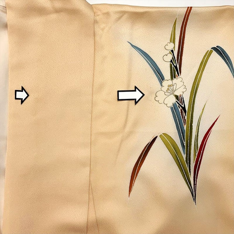 【状態ランクB】上前、花の柄にシミ、胸元と衿、袖口、全体的に汚れ。たるみあり