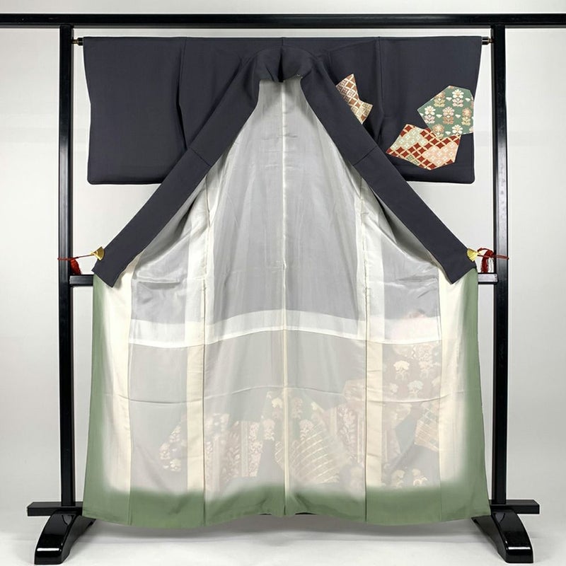 (中古)訪問着 フォーマル グレー 袷 縮緬 切りばめ 花 七宝柄 S【身丈】158.5cm【裄丈】64.5cm