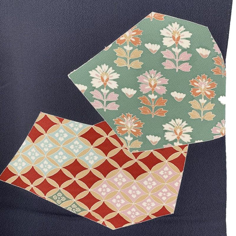 【色柄】グレー 縮緬 切りばめ 花 七宝柄