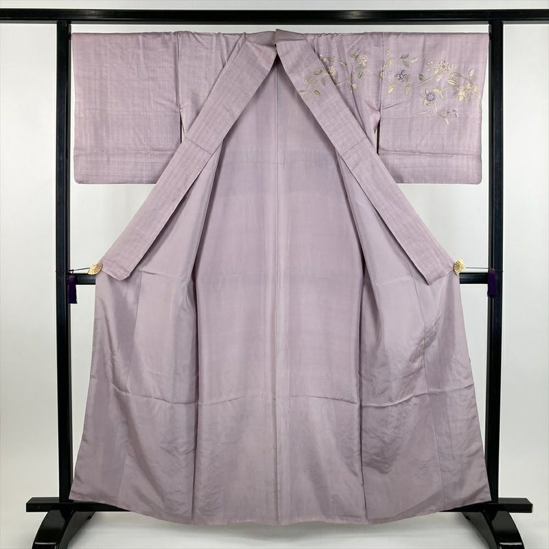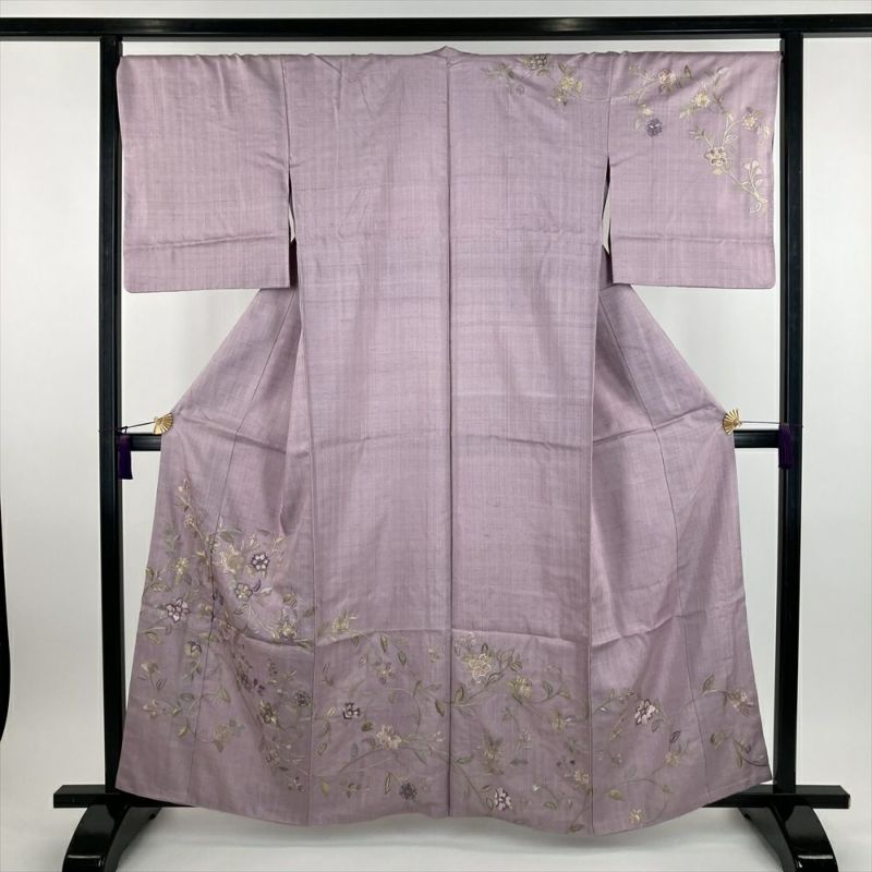 (中古)訪問着 セミフォーマル 薄紫 袷 紬地 蘇州刺繍 金糸 草花 S【身丈】155.5cm【裄丈】68.5cm