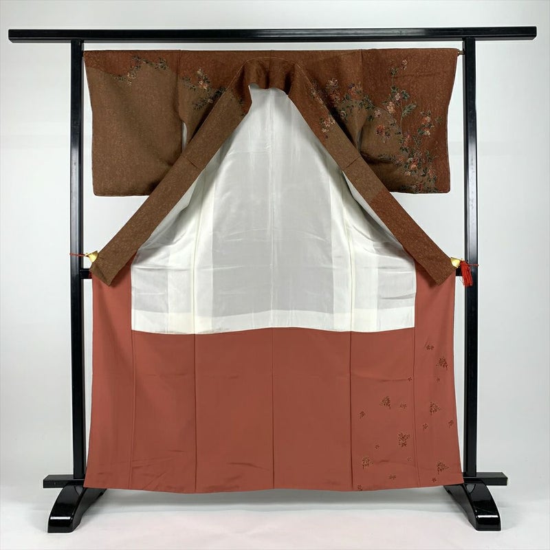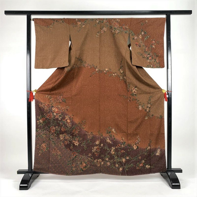 (中古)訪問着 フォーマル 茶 袷 金彩 金通し 縮緬 道長取り 草花 M【身丈】160.5cm【裄丈】67.5cm