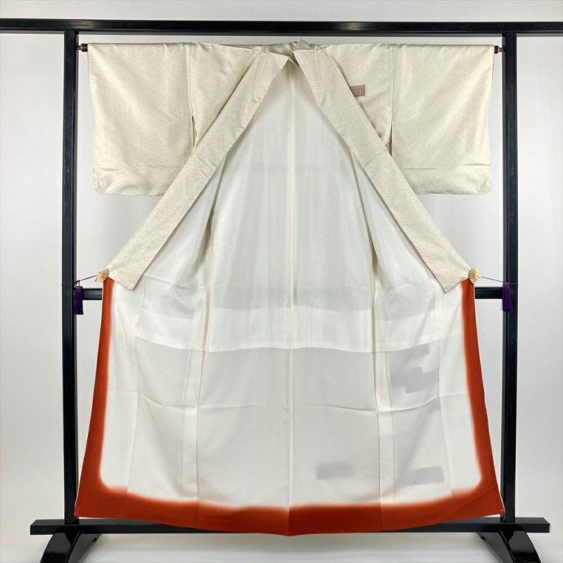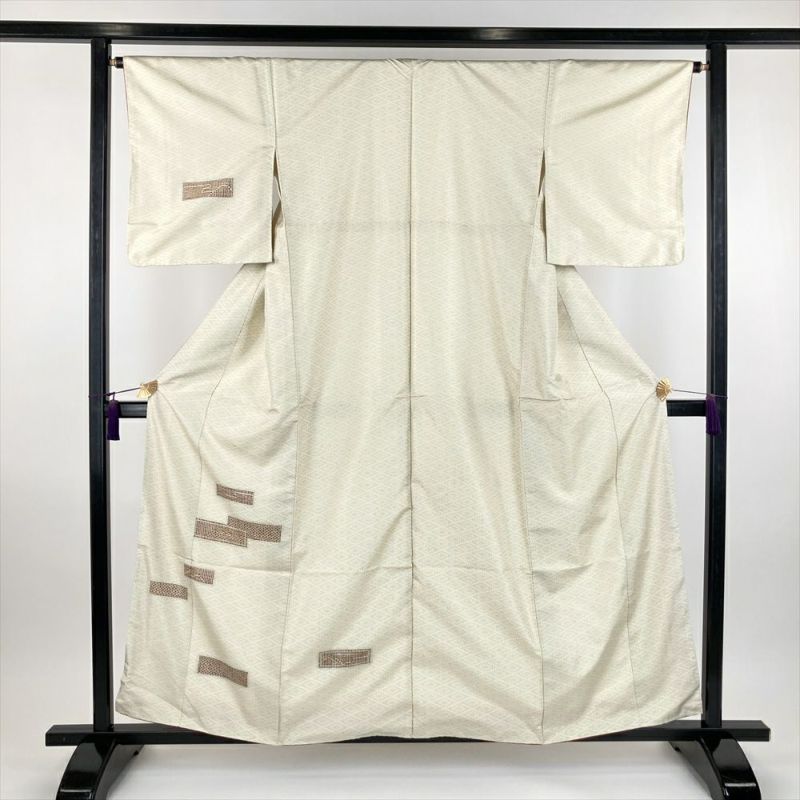 (中古)訪問着 薄黄 クリーム セミフォーマル カジュアル 織り 菱取り 十字 すかし刺 袷 SS【身丈】154cm【裄丈】64.5cm