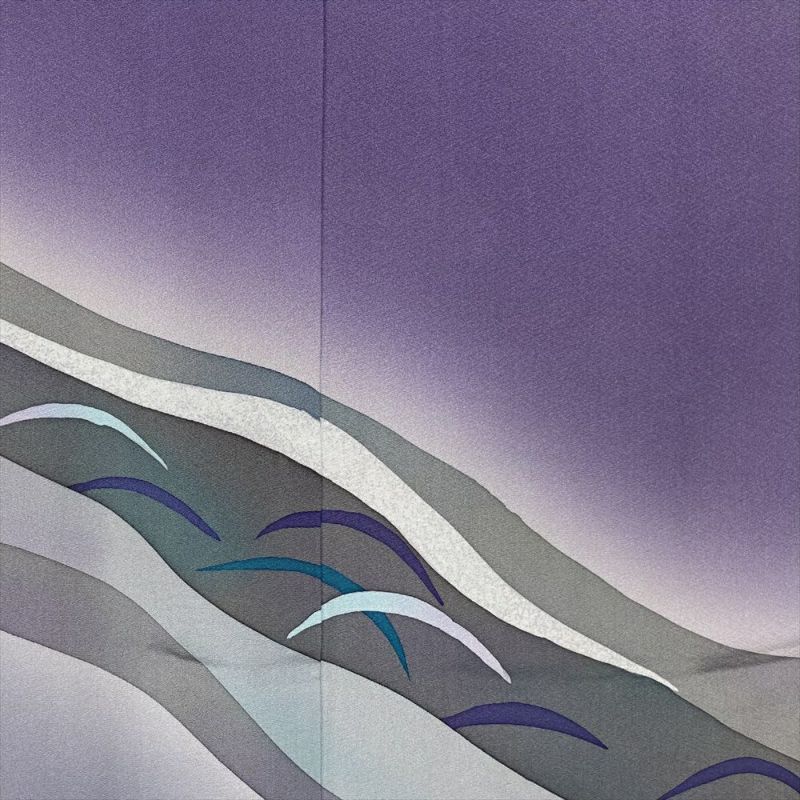 しっとりとした正絹ちりめんの生地に、妖艶な紫色が美しくぼかし染めされた訪問着。グラフィカルな霞に露芝がモダンな雰囲気を醸し出し、大人の女性の魅力を引き立てます。