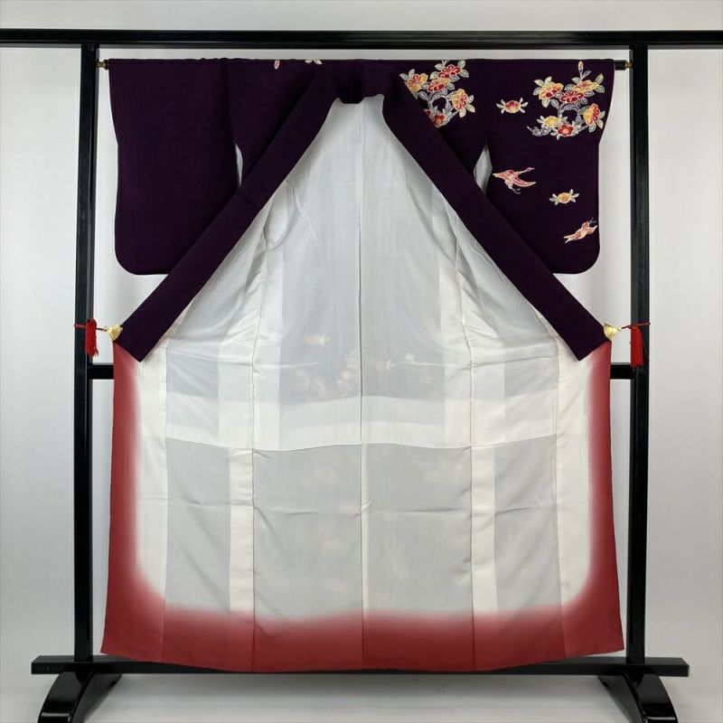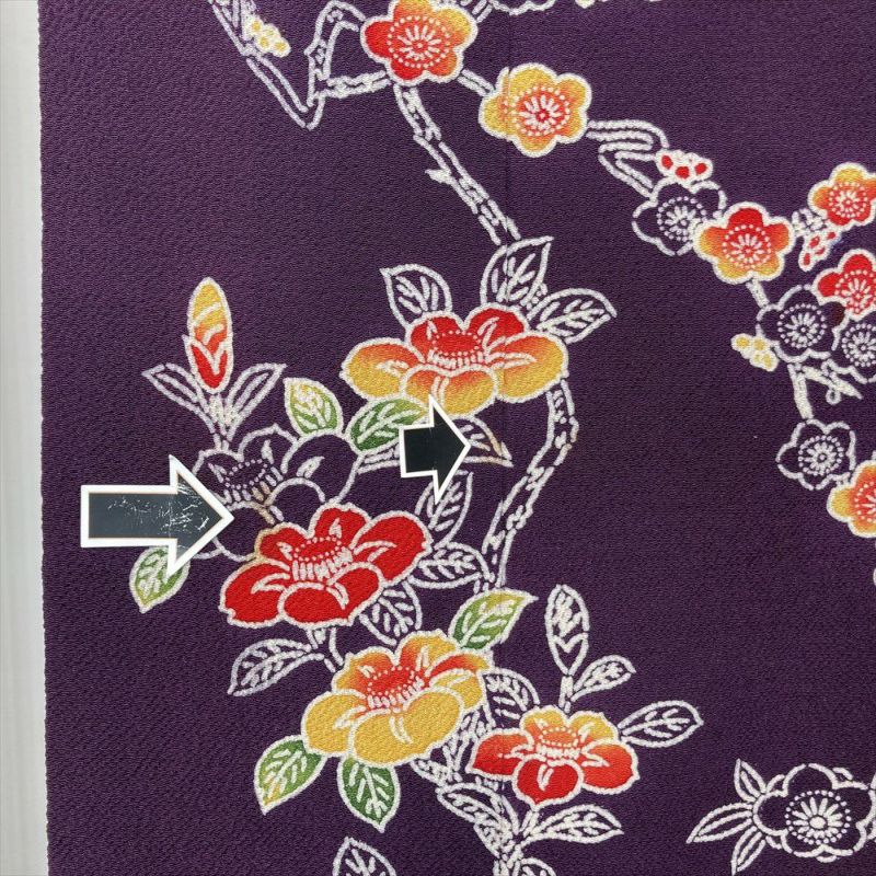 (中古)訪問着 紫 フォーマル セミフォーマル ちりめん 型絵染め 椿 梅 鶴 袷 S【身丈】156.5cm【裄丈】65cm