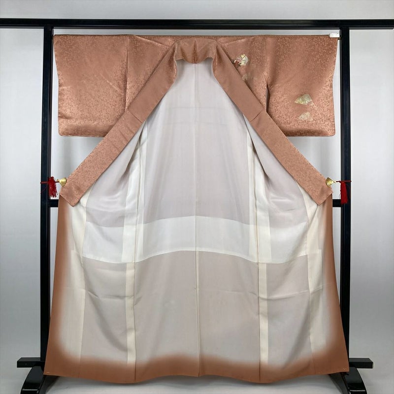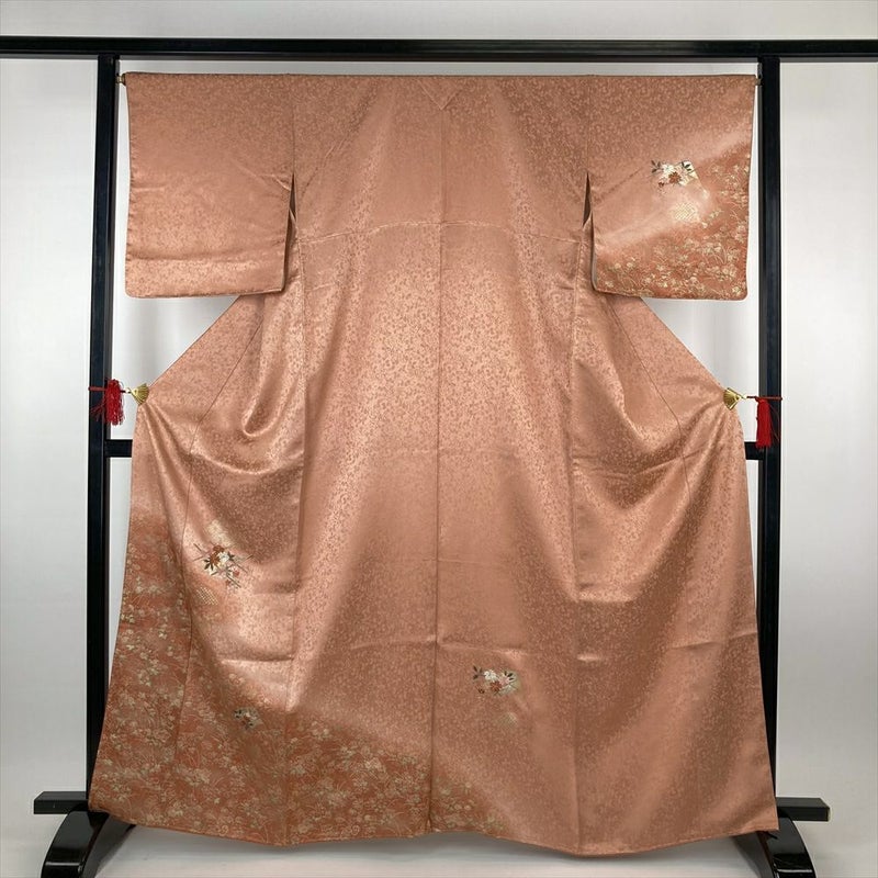 (中古)訪問着 コーラルピンク フォーマル セミフォーマル 地紋織り 金彩 刺繍 扇 花 袷 M【身丈】162cm【裄丈】67cm