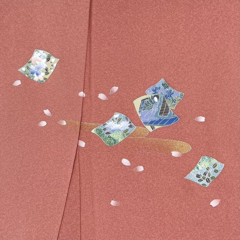 しっとりとした光沢が美しい生地に、扇や色紙が舞うように配置され、動きのある優雅な印象を演出します。