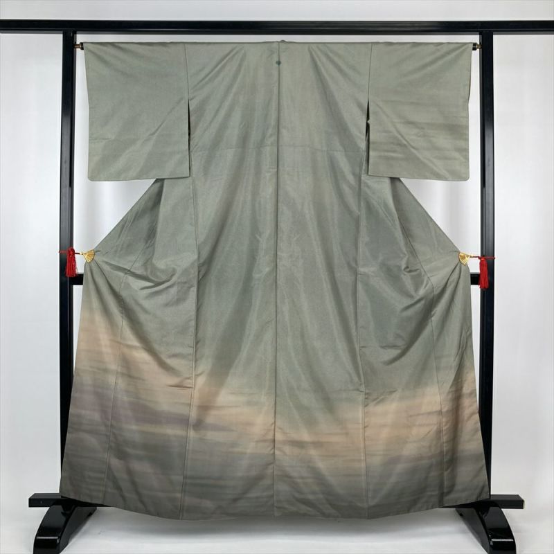 (中古)訪問着 緑 セミフォーマル 紬 ぼかし染め 山並み 霞 一つ紋 袷 S【身丈】156.5cm【裄丈】65.5cm