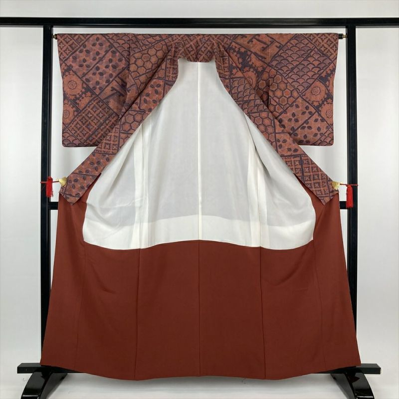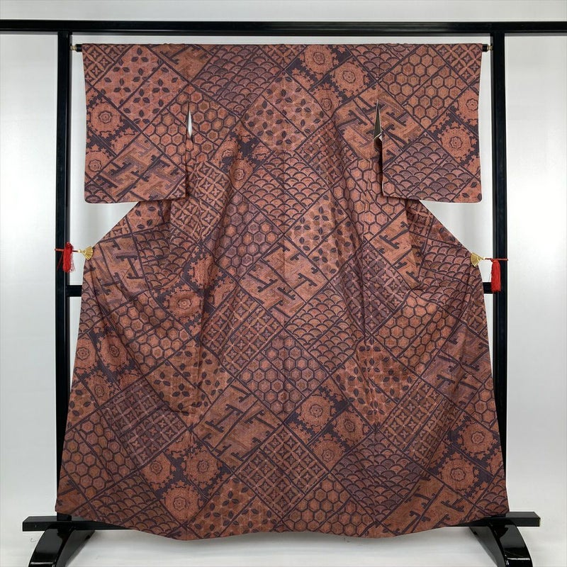 (中古)訪問着 茶色地 カジュアル 紬地 華文 七宝 亀甲 菱 紗綾型 袷 S【身丈】159cm【裄丈】64.5cm