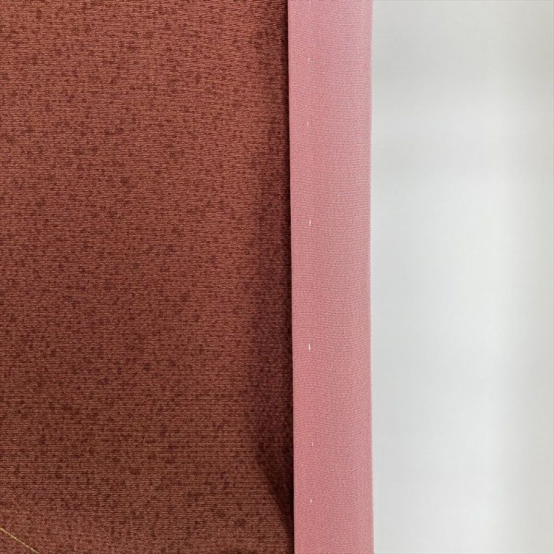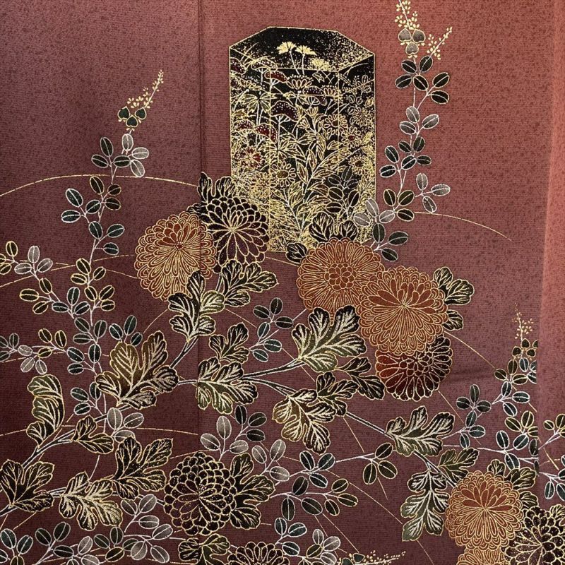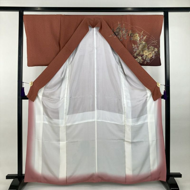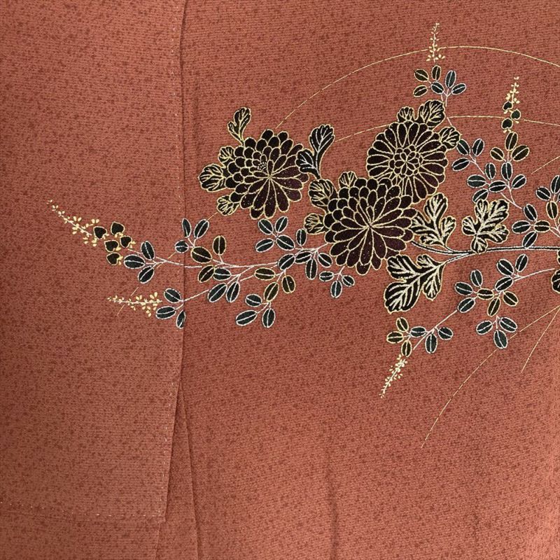 赤茶色に金で菊を描いた訪問着です。フォーマル向きですがしいて言えば秋冬向きの色柄だと思います。右後身と右前身の縫込みの色が合っていませんが、着用には問題はないと思われます。